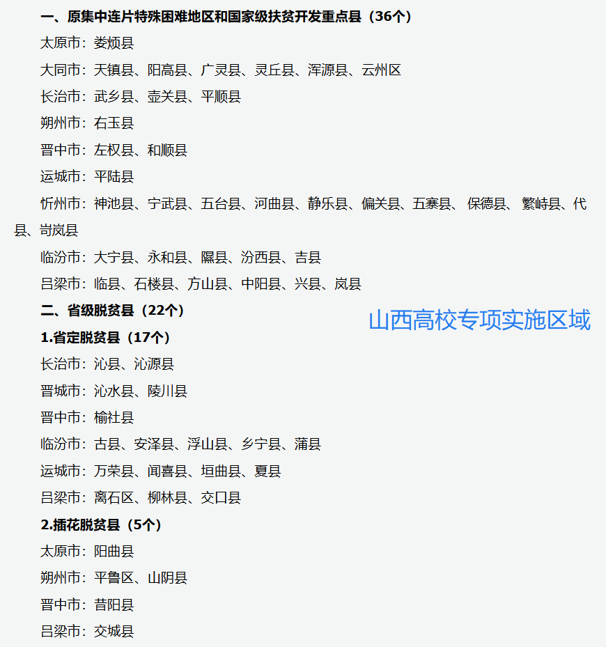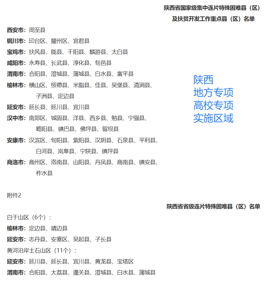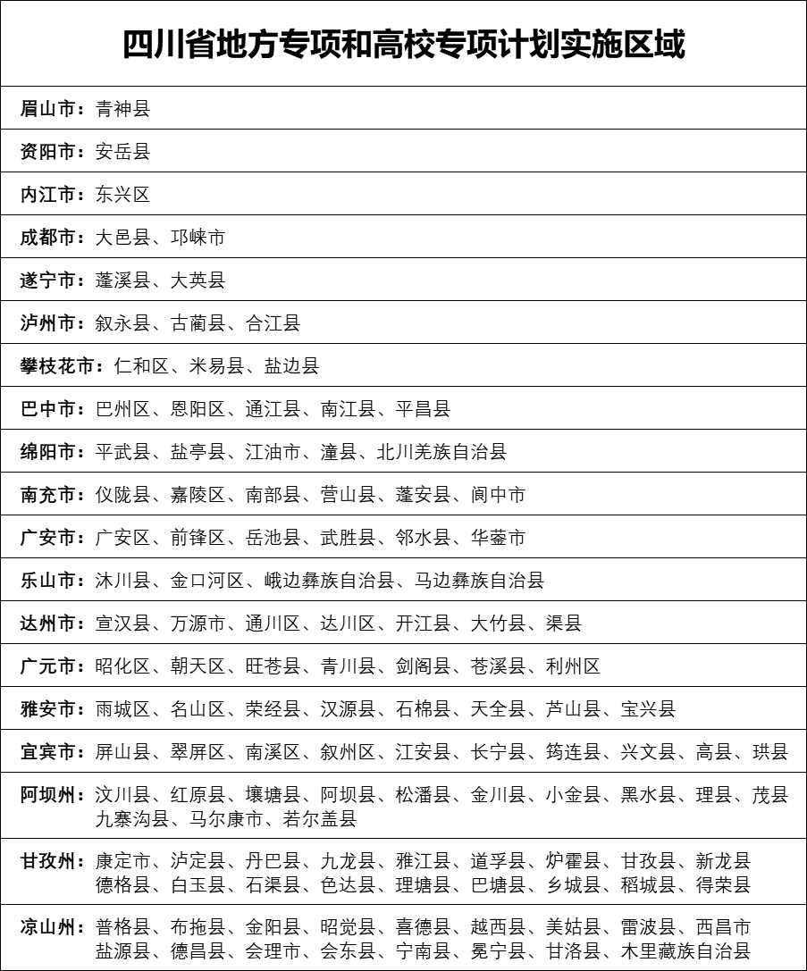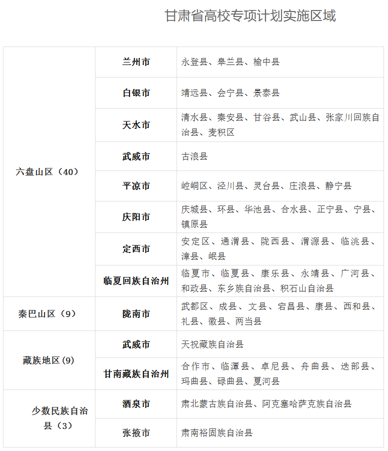 甘肅高校專項計劃實施區(qū)域包含六盤山區(qū)的永登縣、皋蘭縣、榆中縣、靖遠(yuǎn)縣、會寧縣、景泰縣等40個地區(qū);秦巴山區(qū)的武都區(qū)、成縣、文縣、宕昌縣等6個地區(qū);藏族地區(qū)的天祝藏族自治縣、瑪曲縣、碌曲縣、夏河縣等9個地區(qū);少數(shù)民族自治縣的肅北蒙古族自治縣、阿克塞哈薩克族自治縣、肅南裕固族自治縣3個地區(qū)。