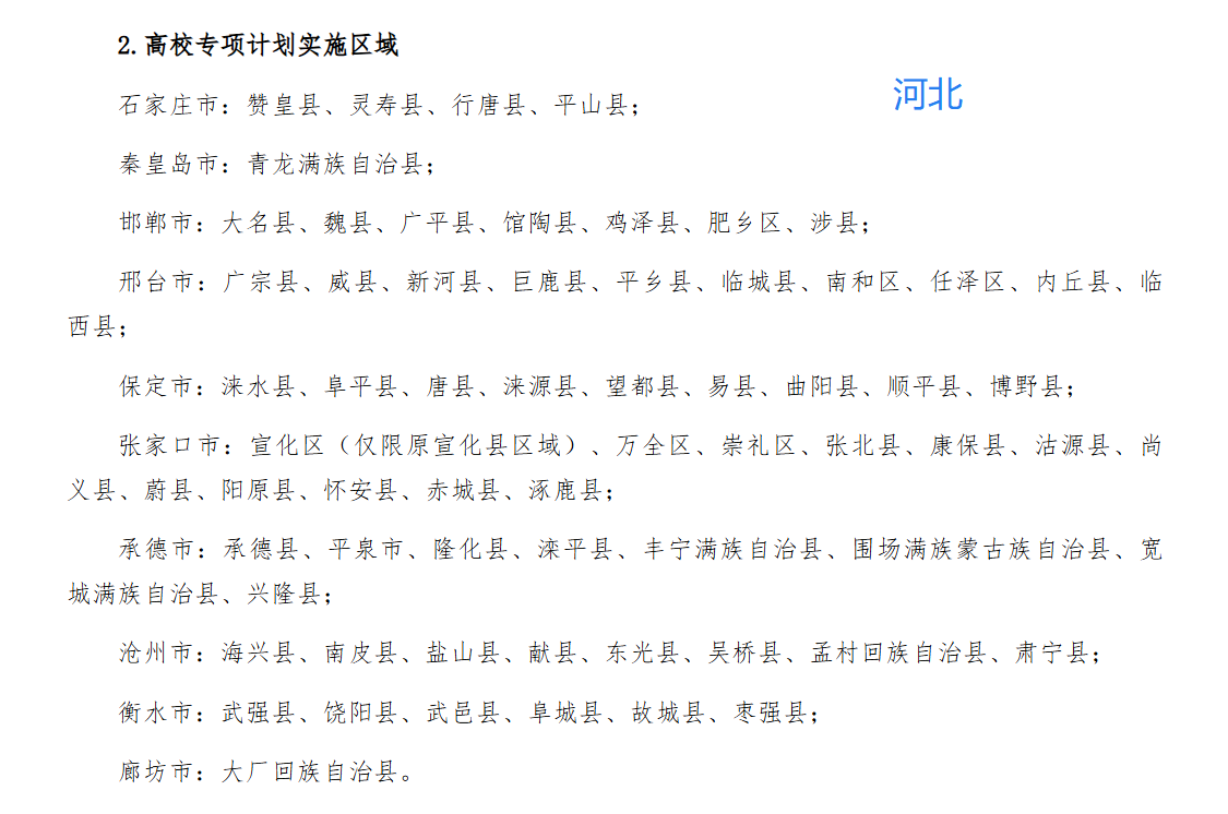 河北高校專項計劃面向贊皇縣、靈壽縣、行唐縣、平山縣、青龍滿族自治縣、大名縣、魏縣、廣平縣、館陶縣、雞澤縣、肥鄉(xiāng)區(qū)、涉縣等地區(qū)的農(nóng)村考生招生。