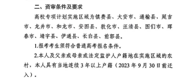 2026年吉林高校專項計劃實施區(qū)域為鎮(zhèn)賚縣、大安市、通榆縣、延吉市、龍井市、和龍市、安圖縣、敦化市、汪清縣、圖們市、琿春市、靖字縣、伊通縣、長白縣、前郭縣。