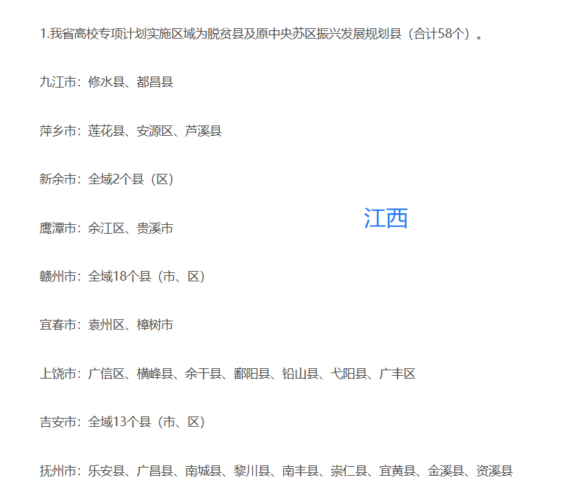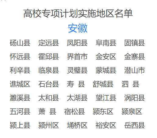 安徽高校專項計劃實施區(qū)域涉及碭山縣、定遠(yuǎn)縣、鳳陽縣、阜南縣、固鎮(zhèn)縣懷遠(yuǎn)縣、霍邱縣、界首市、金安區(qū)、金寨縣利辛縣、臨泉縣、靈璧縣、蒙城縣、潛山市等35個縣。