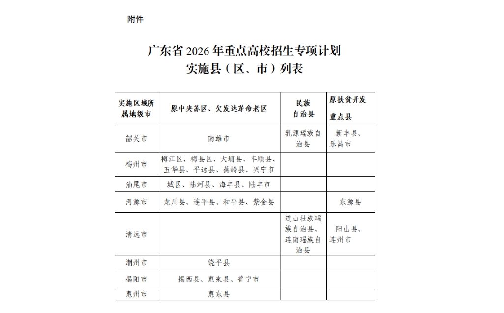 2026年廣東高校專項計劃實施區(qū)域包含梅州市的梅江區(qū)、梅縣區(qū)、大埔縣、豐順縣、五華縣、平遠(yuǎn)縣、蕉嶺縣、興寧市;汕尾市的城區(qū)、陸河縣、海豐縣、陸豐市;河源市的龍川縣、連平縣、和平縣、紫金縣、東源縣等地區(qū)。