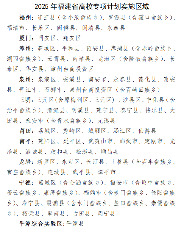 福建高校專項計劃實施區(qū)域涉及福州的連江縣(含小滄畬族鄉(xiāng))、羅源縣(含霍口畬族鄉(xiāng))、福清市、長樂區(qū)、閩侯縣、閩清縣、永泰縣;廈門的同安區(qū)、翔安區(qū);漳州的薌城區(qū)、平和縣、詔安縣、漳浦縣(含赤嶺畬族鄉(xiāng)、湖西畬族鄉(xiāng))等地區(qū)。