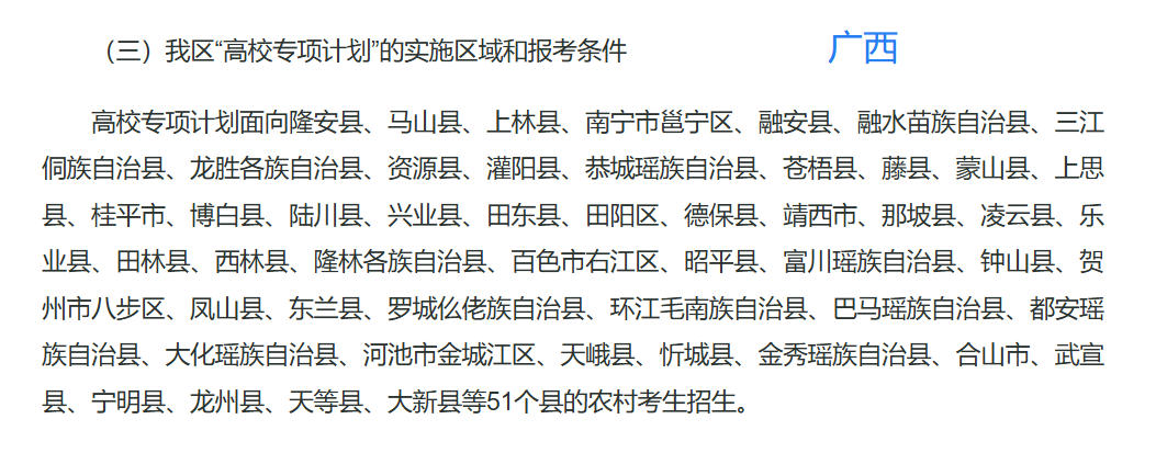 廣西高校專項計劃面向隆安縣、馬山縣、上林縣、南寧市邕寧區(qū)、融安縣、融水苗族自治縣、三江侗族自治縣、龍勝各族自治縣、資源縣、灌陽縣等51個縣的農(nóng)村考生招生。