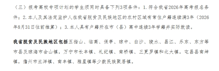 2026年海南高校專項計劃實施區(qū)域包含五指山、臨高、保亭、瓊中、白沙、陵水、昌江、樂東、東方等市縣及瓊海市會山鎮(zhèn),萬寧市長豐鎮(zhèn)、禮紀(jì)鎮(zhèn)、南橋鎮(zhèn)、三更羅鎮(zhèn)和北大鎮(zhèn),屯昌縣南坤鎮(zhèn),儋州市蘭洋鎮(zhèn)、南豐鎮(zhèn)、雅星鎮(zhèn)等少數(shù)民族聚居鎮(zhèn)。