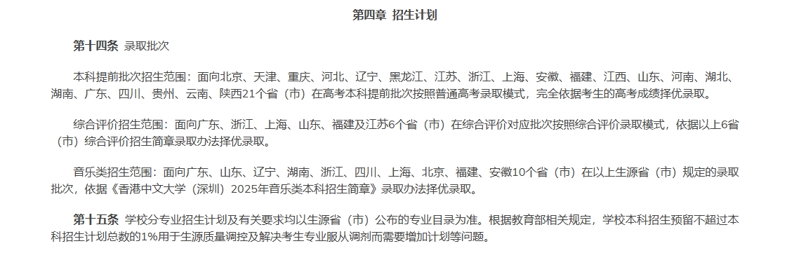 根據(jù)2025年香港中文大學(xué)(深圳)的招生簡章來看,學(xué)校僅在北京、天津、重慶、遼寧、黑龍江、江蘇等21個(gè)省市本科提前批進(jìn)行招生,完全按照考生的高考成績擇優(yōu)錄取。