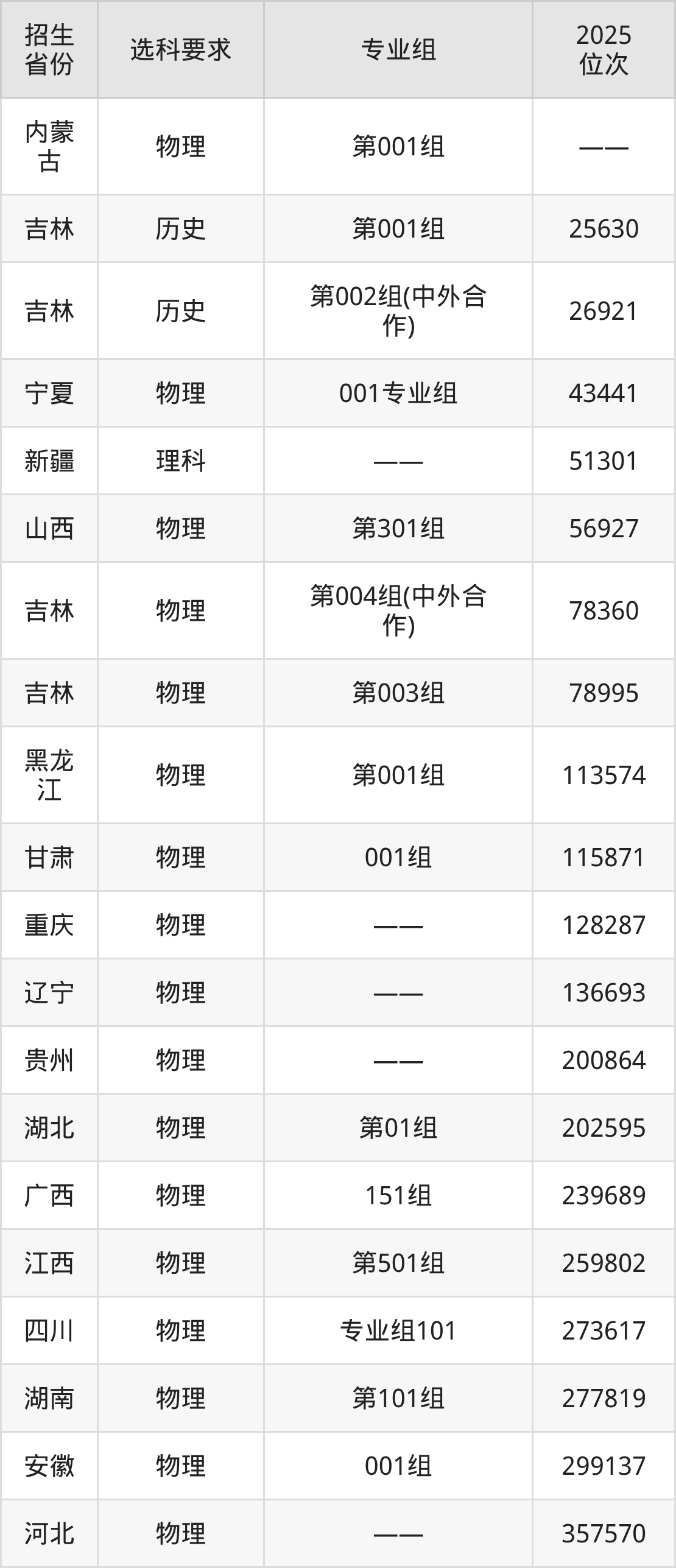 遼源職業(yè)技術(shù)學(xué)院2025年在全國各省的位次差異較大,最高位次是25630位(吉林歷史類)、最低位次是357570位(河北物理類)。各省具體位次請(qǐng)看下圖: