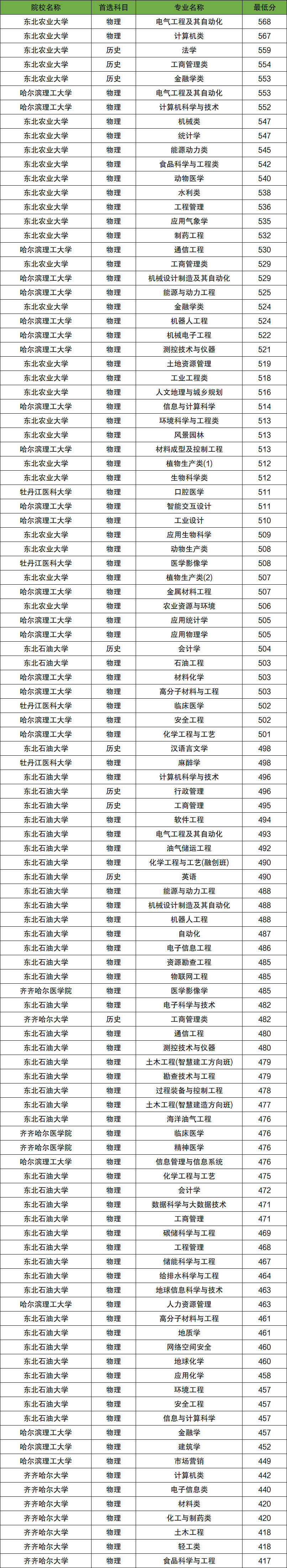 2025年黑龍江地方專項計劃物理類錄取分數(shù)線417分到568分之間,分數(shù)線最低的是齊齊哈爾大學食品科學與工程專業(yè)、分數(shù)線最高的是東北農(nóng)業(yè)大學電氣工程及其自動化專業(yè)。