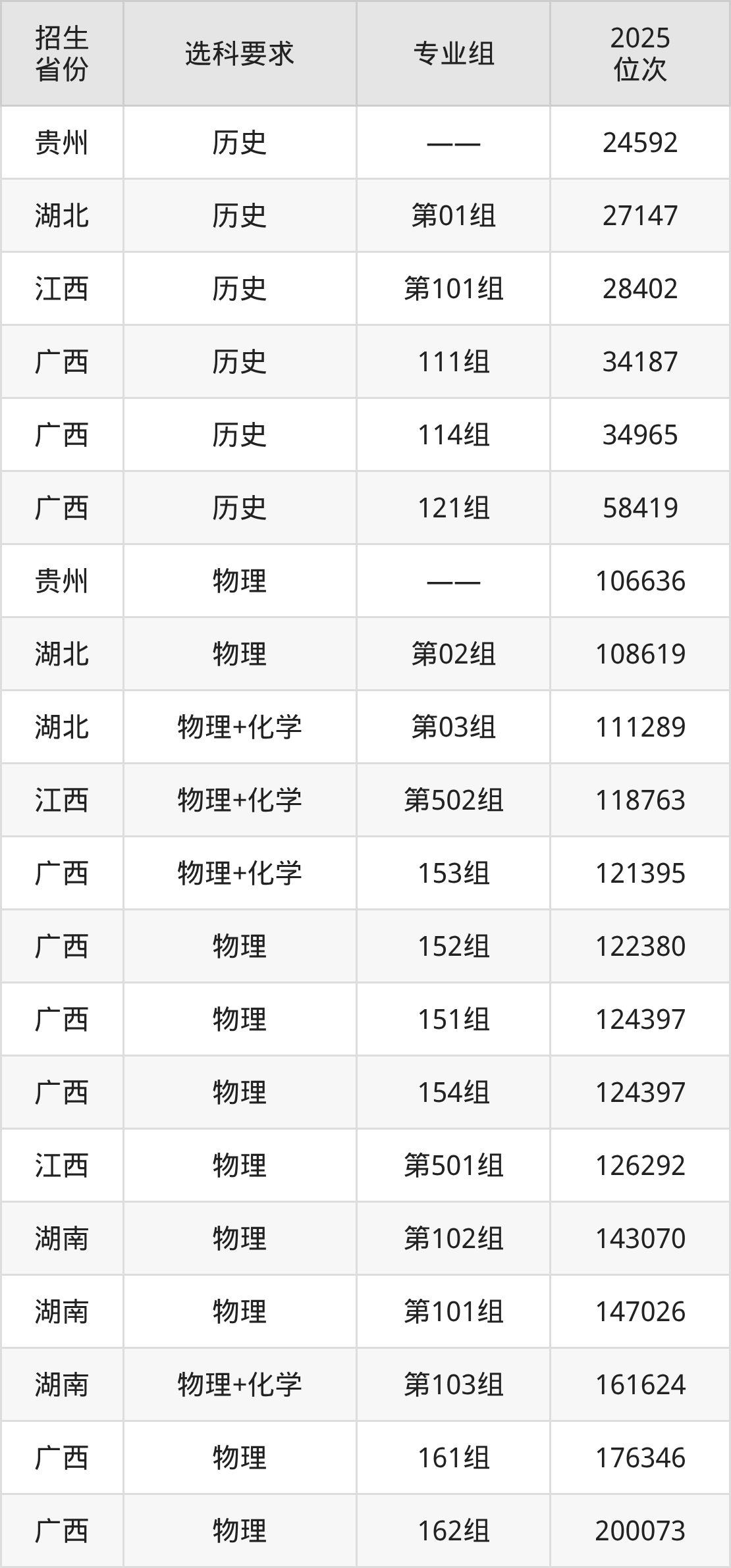 廣西職業(yè)師范學院2025年在全國各省的位次差異較大,最高位次是24592位(貴州歷史類)、最低位次是200073位(廣西物理類)。各省具體位次請看下圖: