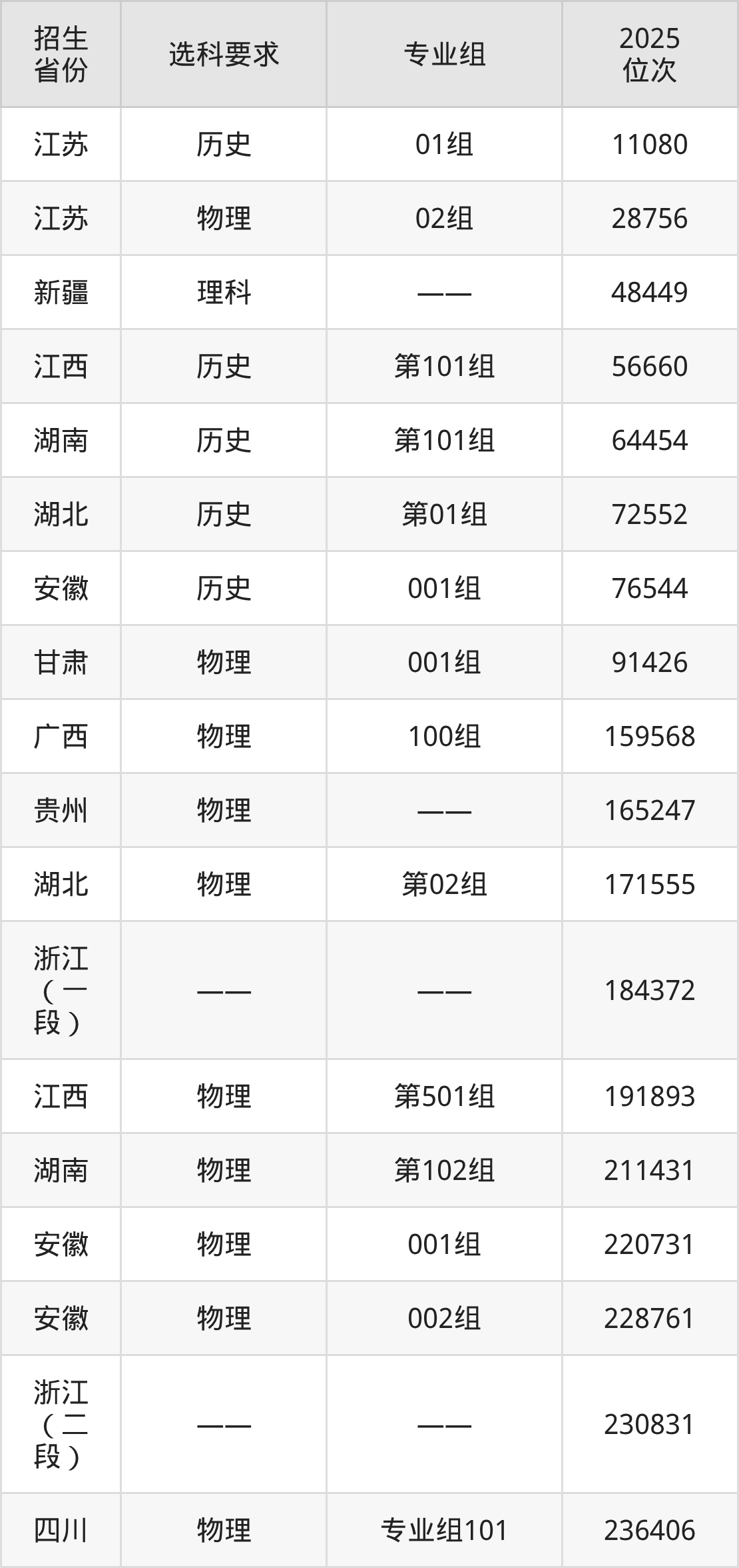浙江國際海運職業(yè)技術(shù)學(xué)院2025年在全國各省的位次差異較大,最高位次是11080位(江蘇歷史類)、最低位次是236406位(四川物理類)。各省具體位次請看下圖: