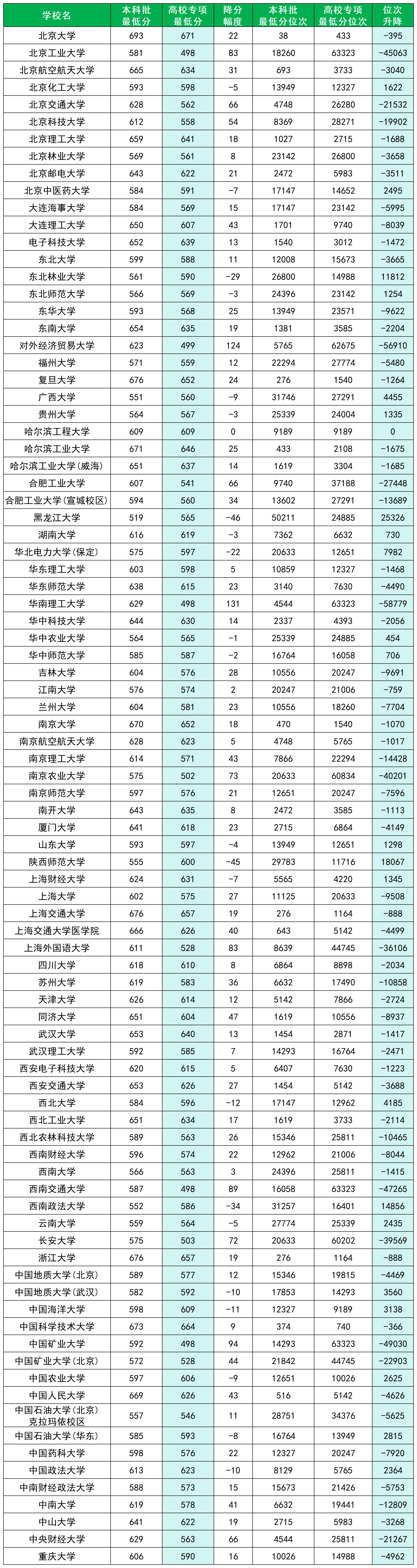 注:下文為各大學(xué)統(tǒng)招最低分(不含單列)和高校專項計劃最低分對比。