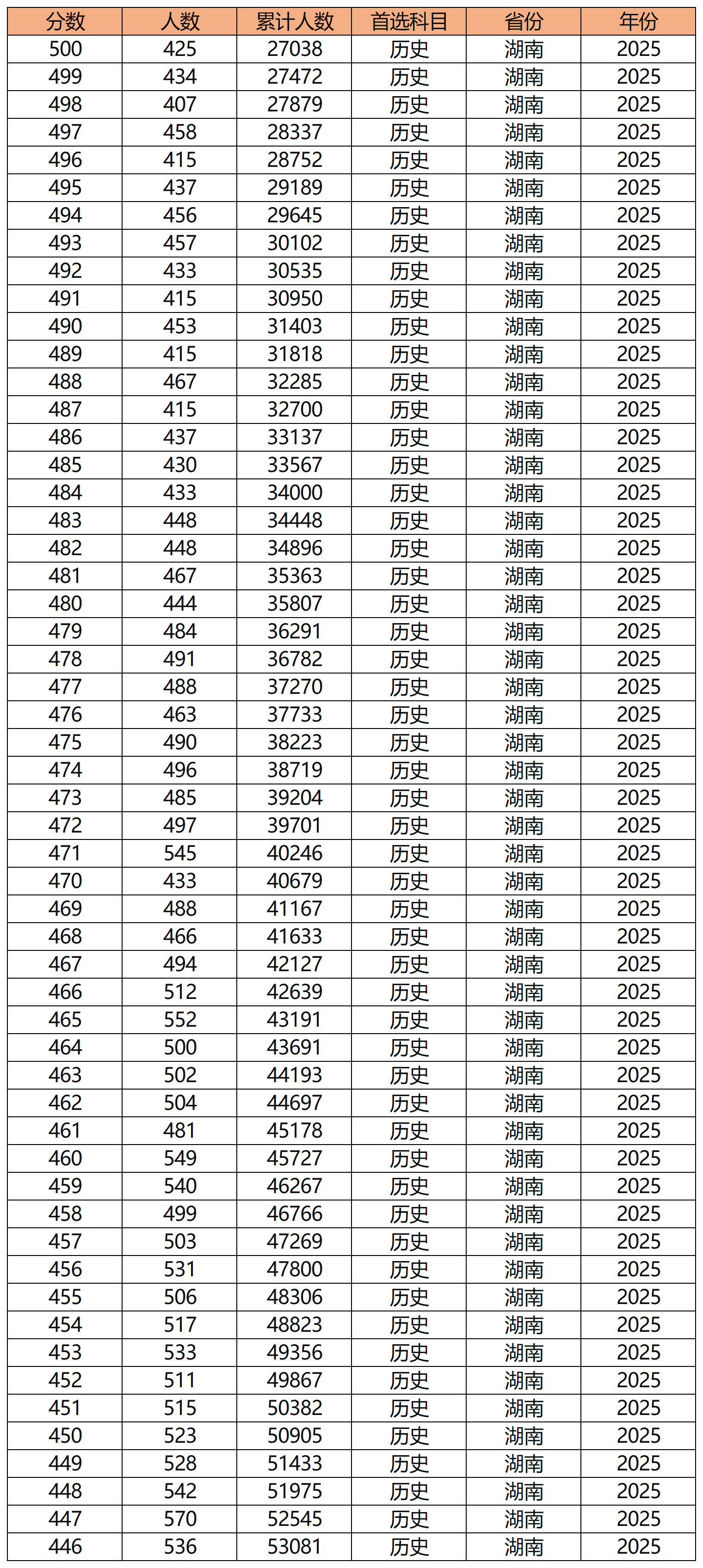 根據(jù)2025年湖南歷史類一分一段表顯示,歷史類本科線(446分)對應(yīng)的最低位次為53081名,那么2026屆歷史類位次排名在53081名及以內(nèi)的考生大概率能上本科。