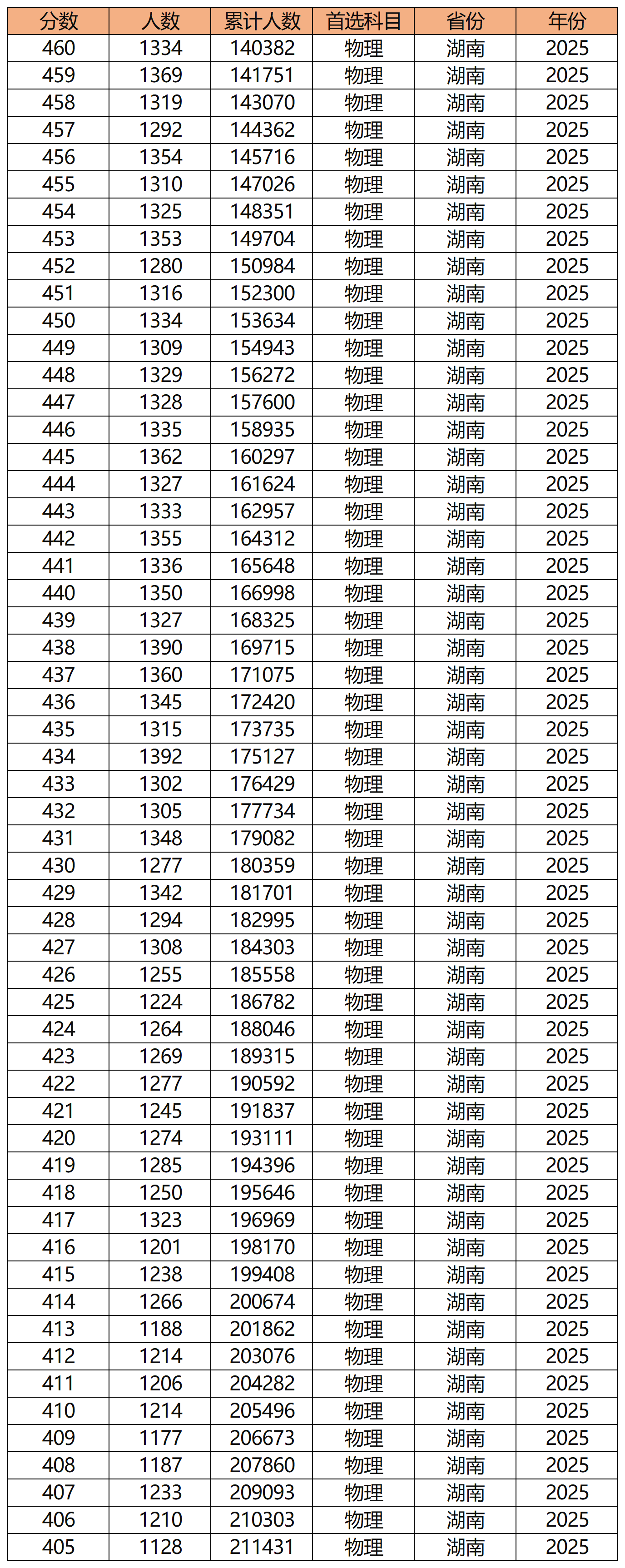 2025年湖南高考分?jǐn)?shù)線和一分一段表顯示,物理類本科線405分,對應(yīng)最低位次211431名,歷史類本科線446分,對應(yīng)最低位次53081名。