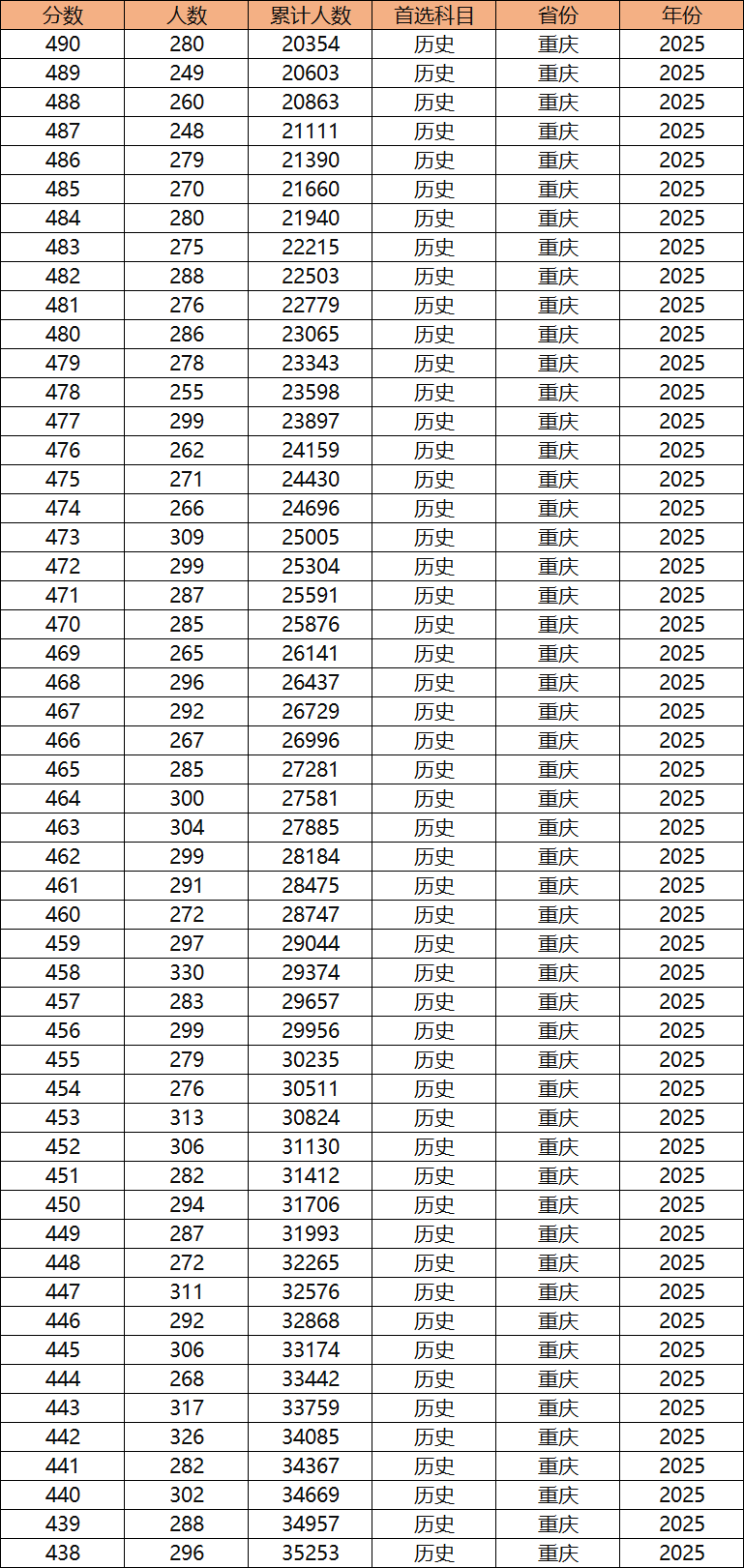 根據(jù)2025年重慶歷史類一分一段表顯示,歷史類本科線(438分)對應(yīng)的最低位次為35253名,那么2026屆歷史類位次排名在35253名及以內(nèi)的考生大概率能上本科。