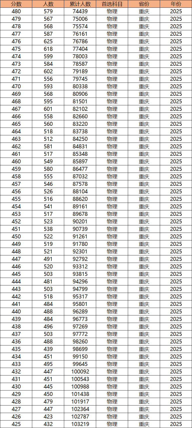 根據(jù)2025年重慶物理類一分一段表顯示,物理類本科線(425分)對應(yīng)的最低位次為103219名,那么2026屆物理類位次排名在103219名及以內(nèi)的考生大概率能上本科。