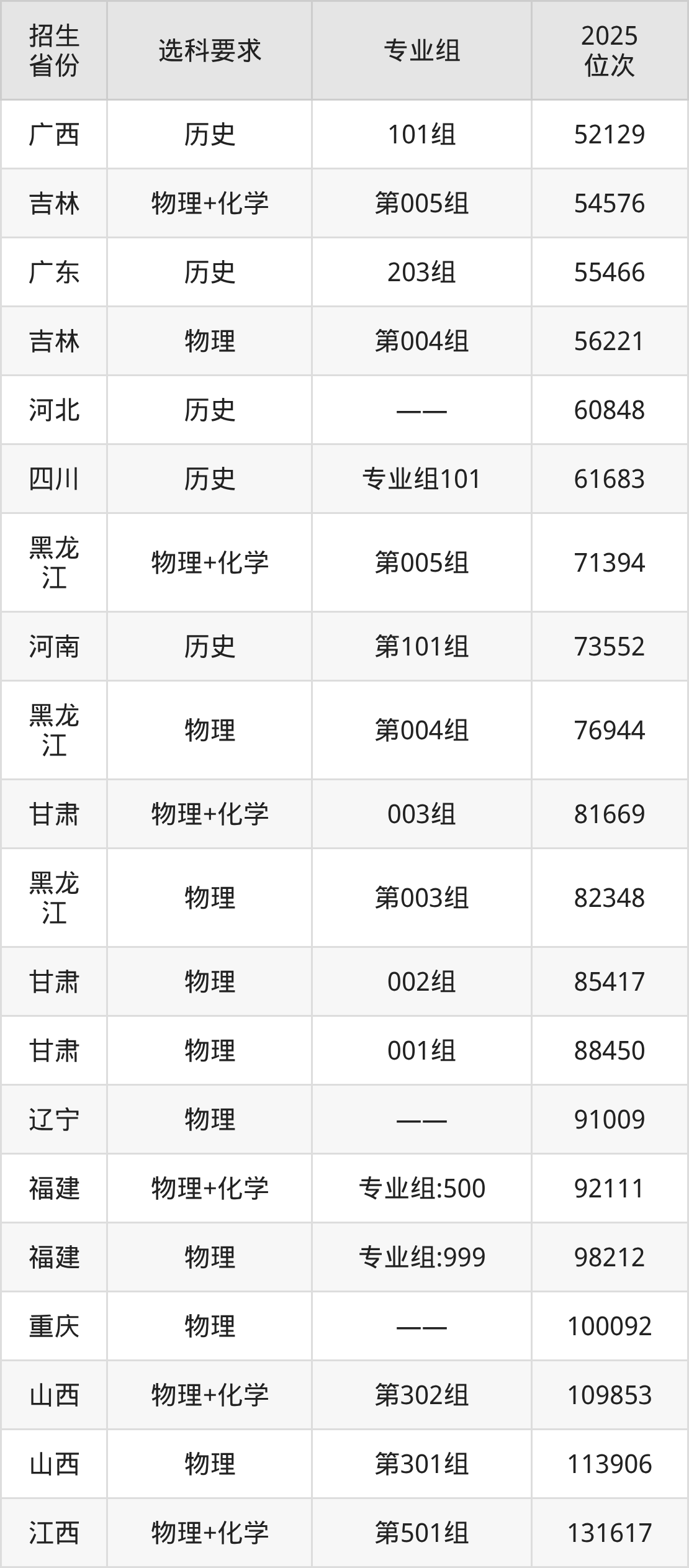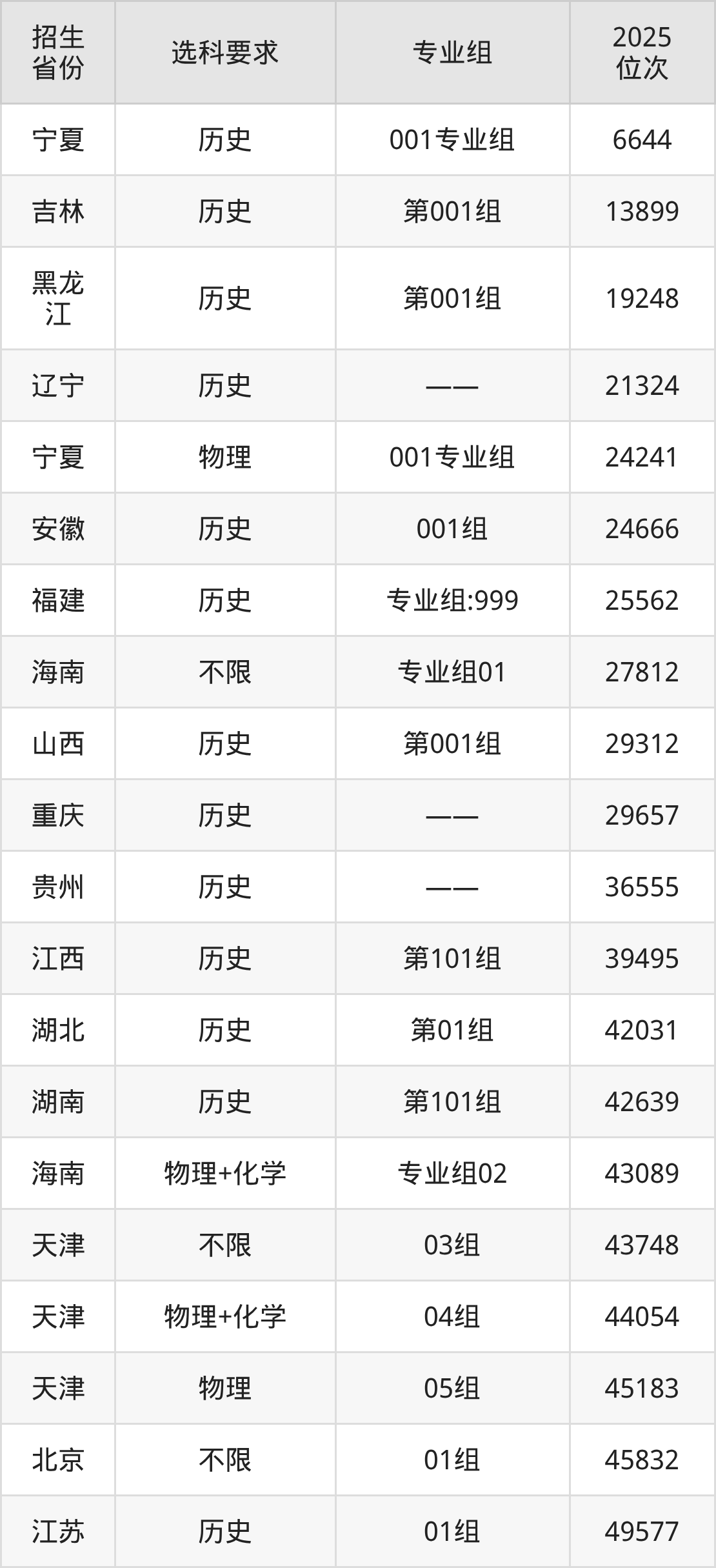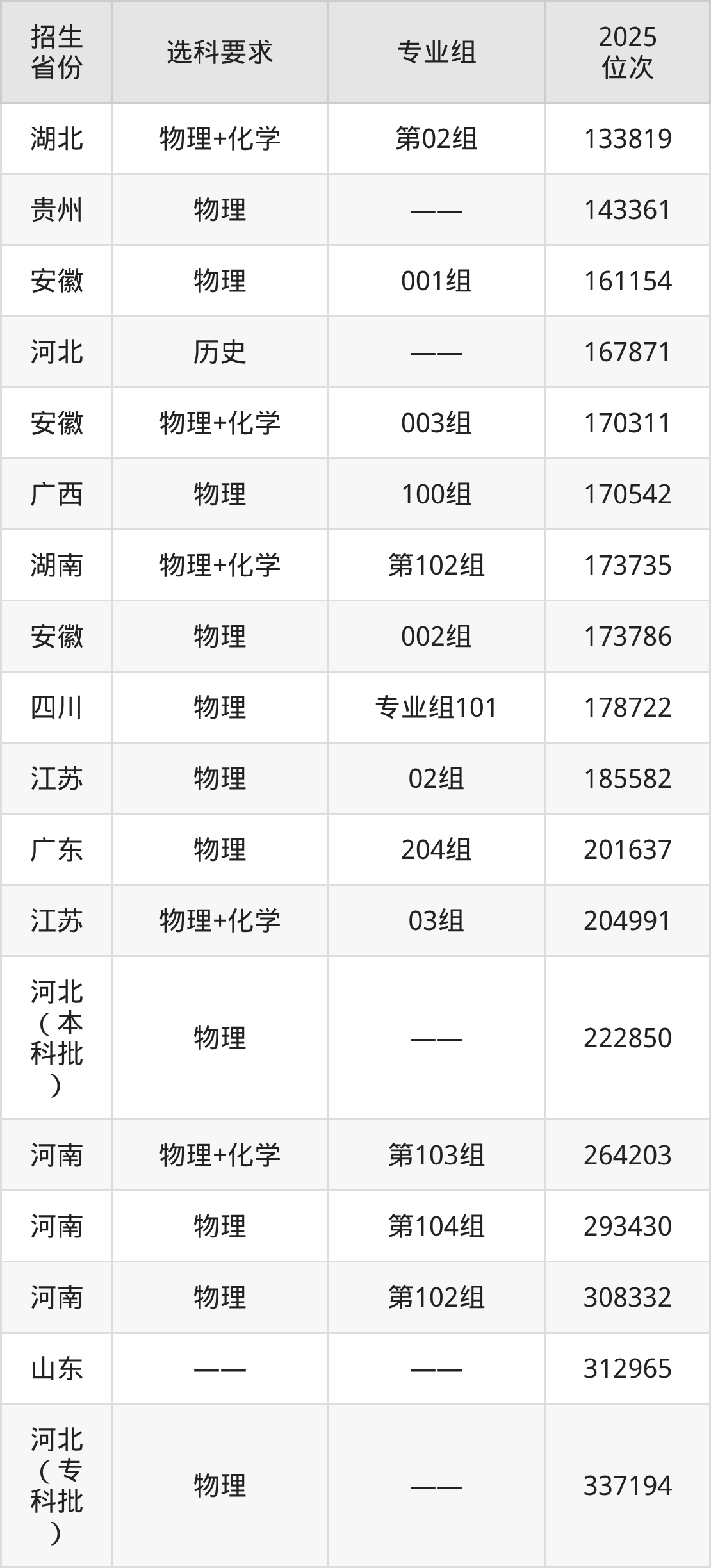 華北理工大學(xué)輕工學(xué)院2025年在全國各省的位次差異較大,最高位次是6644位(寧夏歷史類)、最低位次是337194位(河北物理類)。各省具體位次請看下圖: