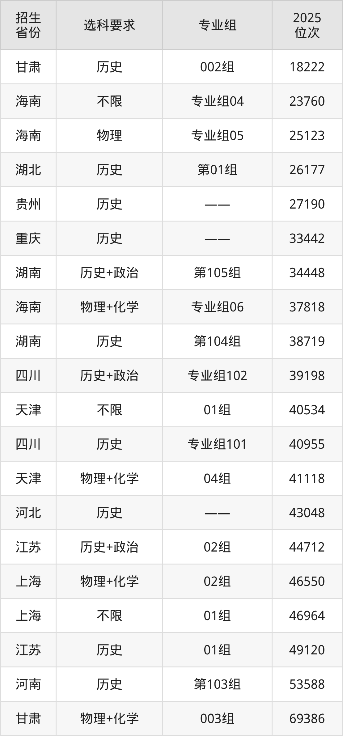 重慶城市科技學(xué)院2025年在全國各省的位次差異較大,最高位次是18222位(甘肅歷史類)、最低位次是266139位(河南物理類)。各省具體位次請看下圖: