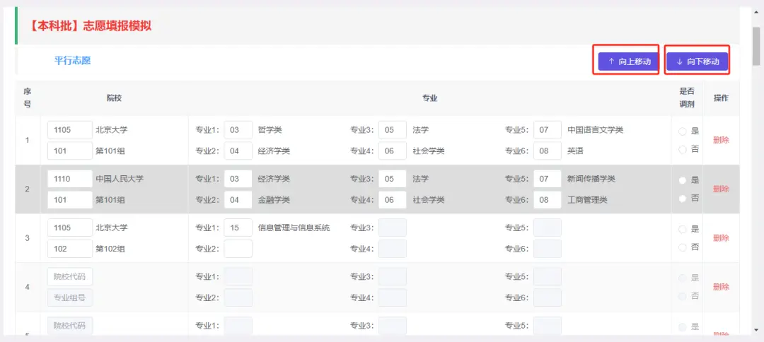 下圖是老師為大家截取的往年河南48個平行志愿填報示例,其中主要包含填報志愿類型及批次、志愿選報院校的相關(guān)信息,如院校名稱、專業(yè)名稱等,考生可對志愿選報院校進(jìn)行刪除、上移、下移等調(diào)整志愿優(yōu)先級操作。