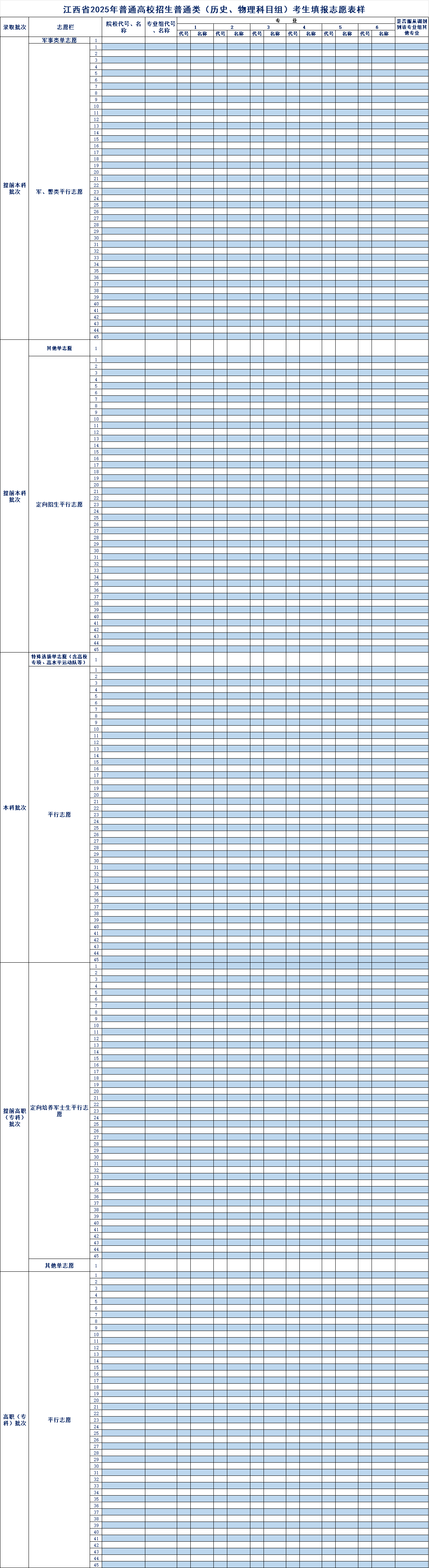 江西高考志愿填報樣表主要分為6列,包括錄取批次、志愿、院校代碼及名稱、專業(yè)組代碼及名稱、專業(yè)名稱代碼及名稱1-6、是否服從專業(yè)調(diào)劑等欄目,江西45個志愿需嚴格按照“沖穩(wěn)?!北壤顖?,一般來說45個志愿沖穩(wěn)保比例有:16:14:15和4:25:16,具體本文為大家詳細介紹。