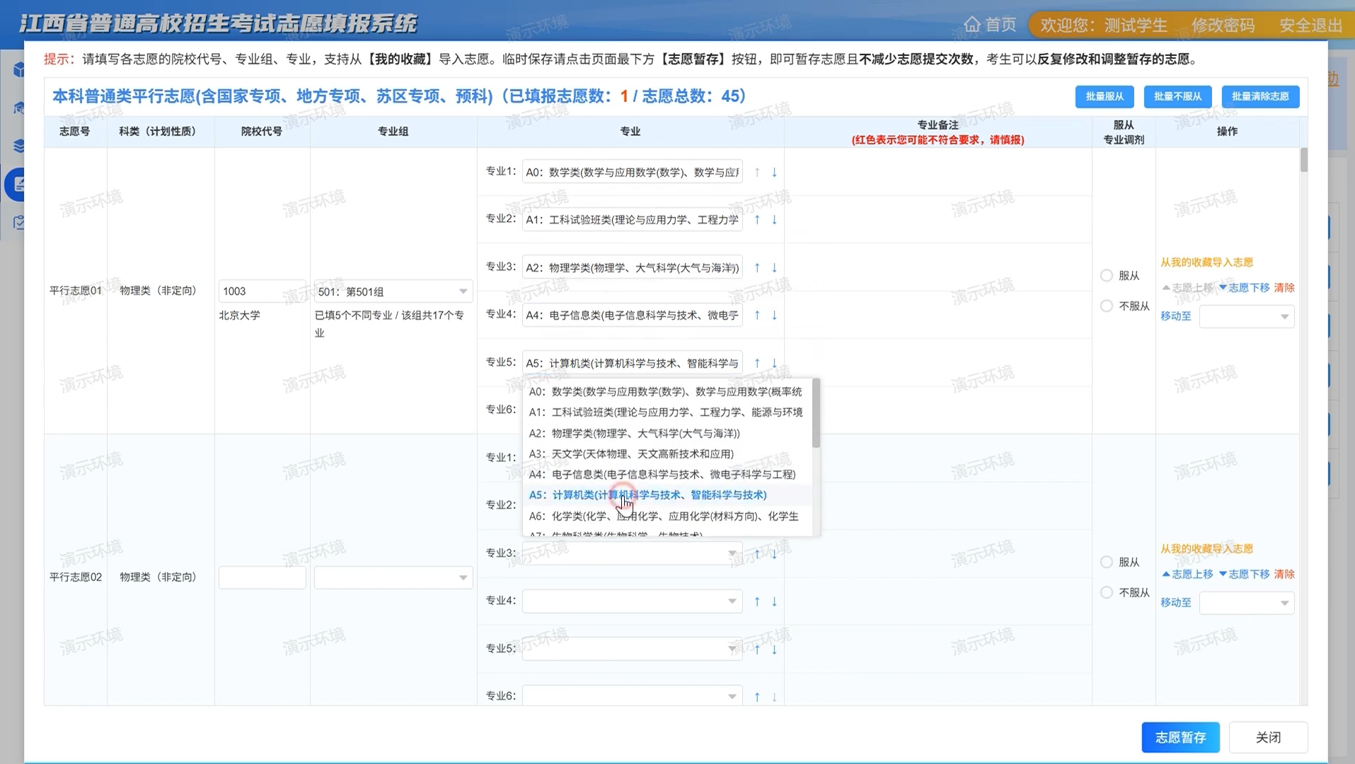 4.普通高職??婆?/b>實行平行志愿,設(shè)置45個院校專業(yè)組志愿,每個組內(nèi)可填6個專業(yè)志愿以及1個是否服從專業(yè)調(diào)劑選項。