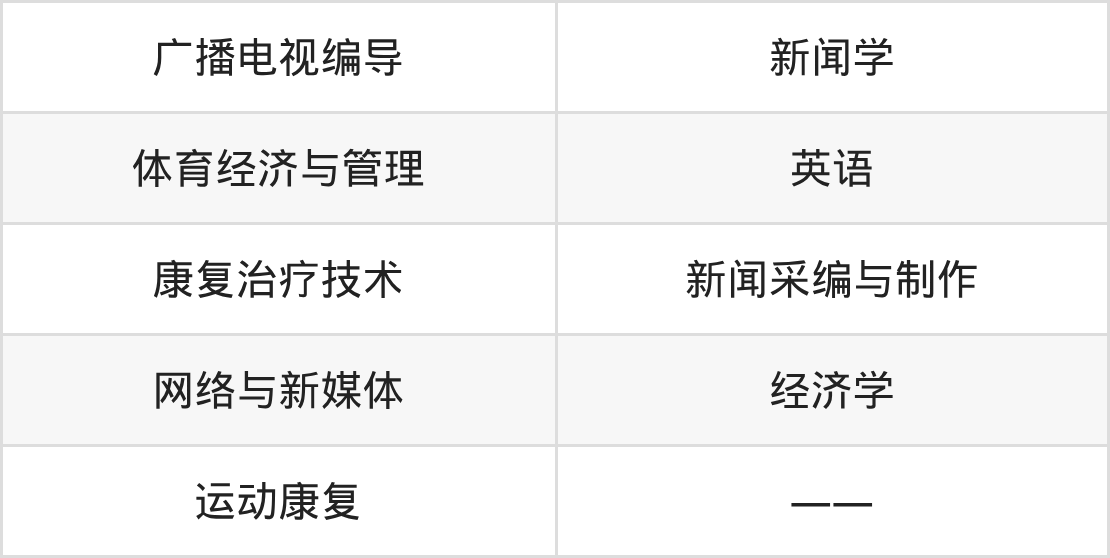 根據(jù)2025年湖北高考招生計劃可知,武漢體育學(xué)院體育科技學(xué)院招生專業(yè)包含廣播電視編導(dǎo)、新聞學(xué)、體育經(jīng)濟與管理等,完整版名單如下。