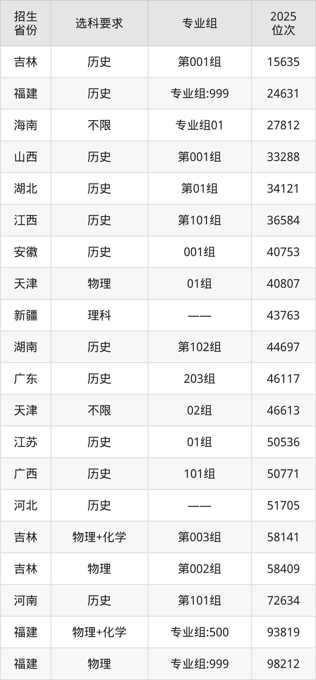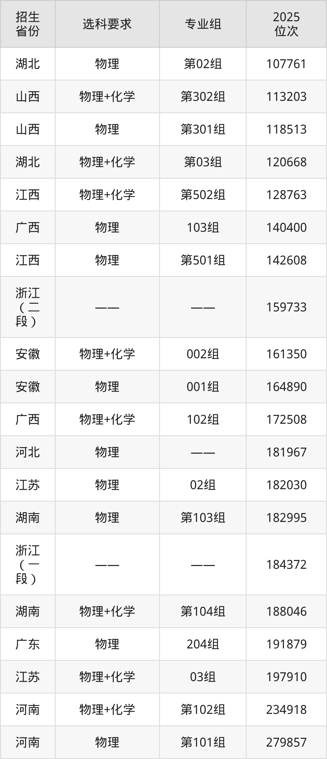 湘潭理工學院2025年在全國各省的位次差異較大,最高位次是15635位(吉林歷史類)、最低位次是279857位(河南物理類)。各省具體位次請看下圖: