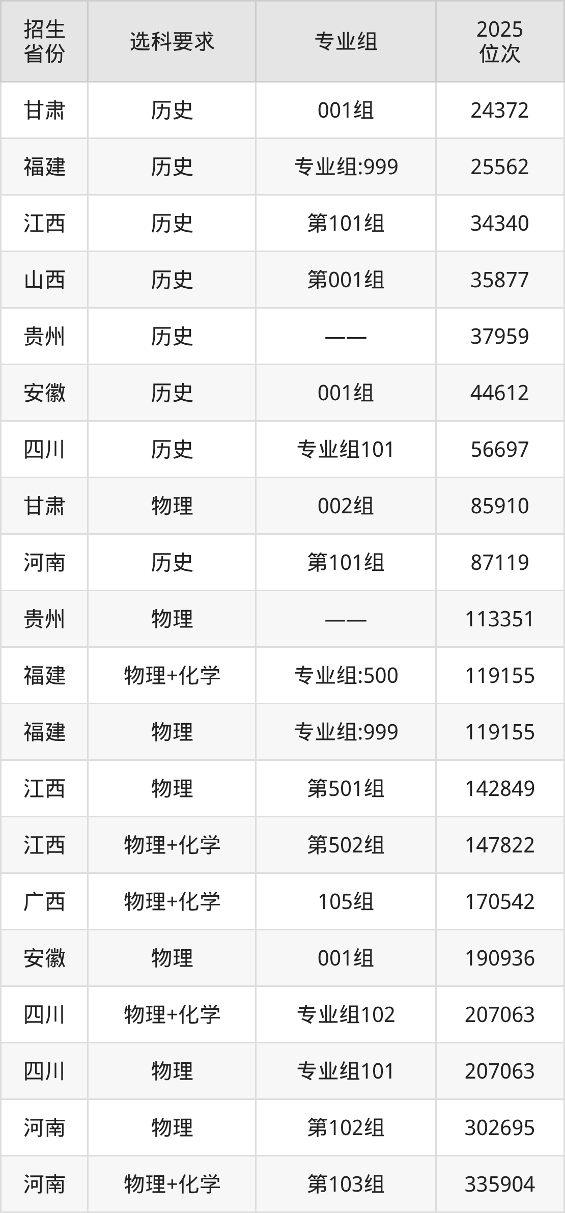福州工商學(xué)院2025年在全國各省的位次差異較大,最高位次是24372位(甘肅歷史類)、最低位次是335904位(河南物理類)。各省具體位次請看下圖: