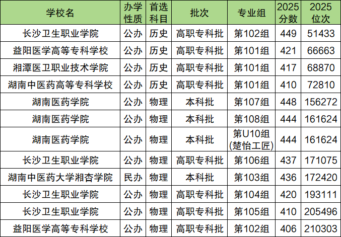 2025年湖南省400-450分的醫(yī)科大學(xué)中,本科招生的有湖南醫(yī)藥學(xué)院第107組(448分)、湖南醫(yī)藥學(xué)院第108組(444分)、湖南醫(yī)藥學(xué)院第U10組(444分)和湖南中醫(yī)藥大學(xué)湘杏學(xué)院第103組(436分),其余學(xué)校均在專科批招生。