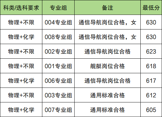 001專業(yè)組:再選科目化學(xué),潛艇崗位合格,最低分601分;