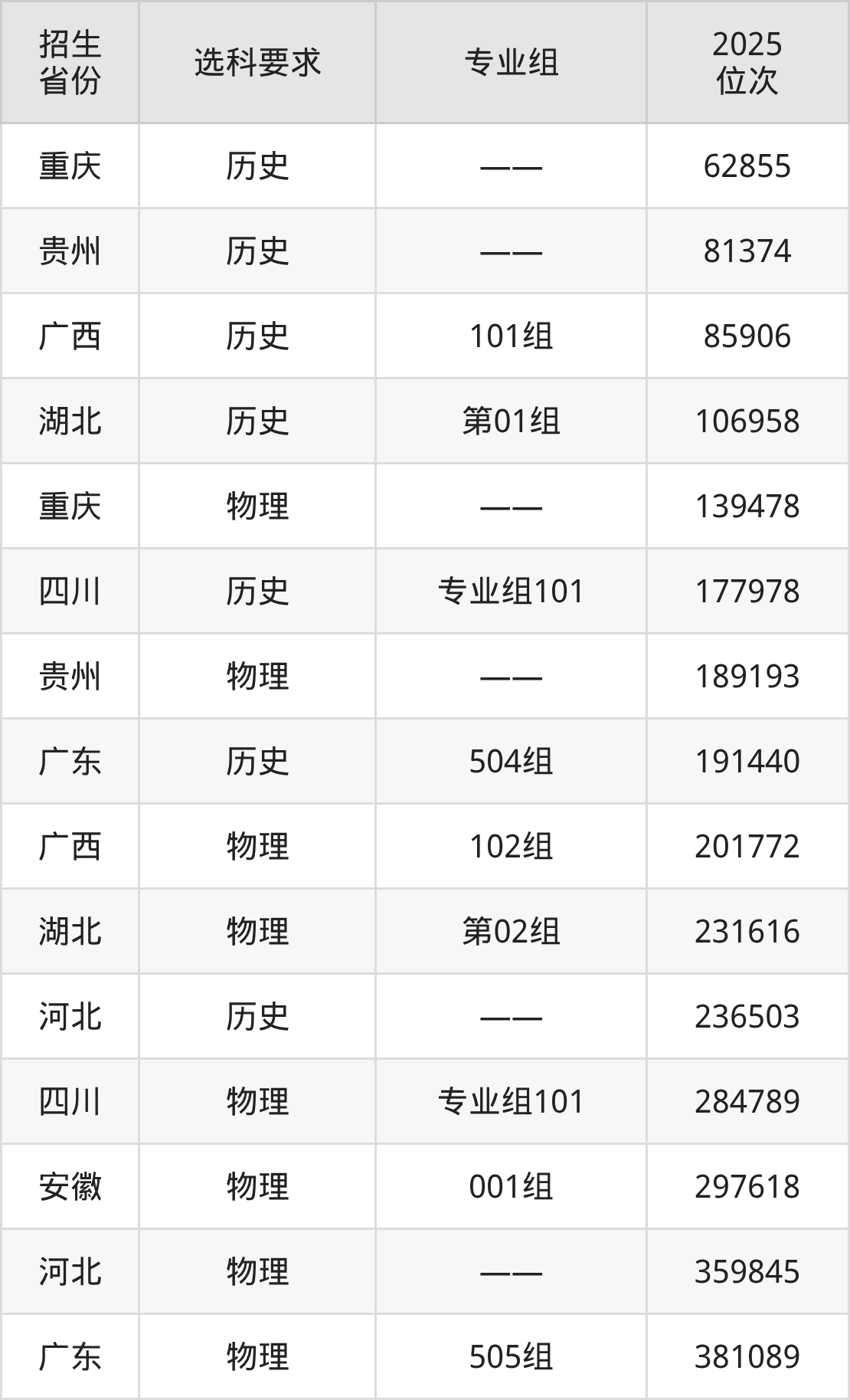 湖南高爾夫旅游職業(yè)學院2025年在全國各省的位次差異較大,最高位次是62855位(重慶歷史類)、最低位次是381089位(廣東物理類)。各省具體位次請看下圖: