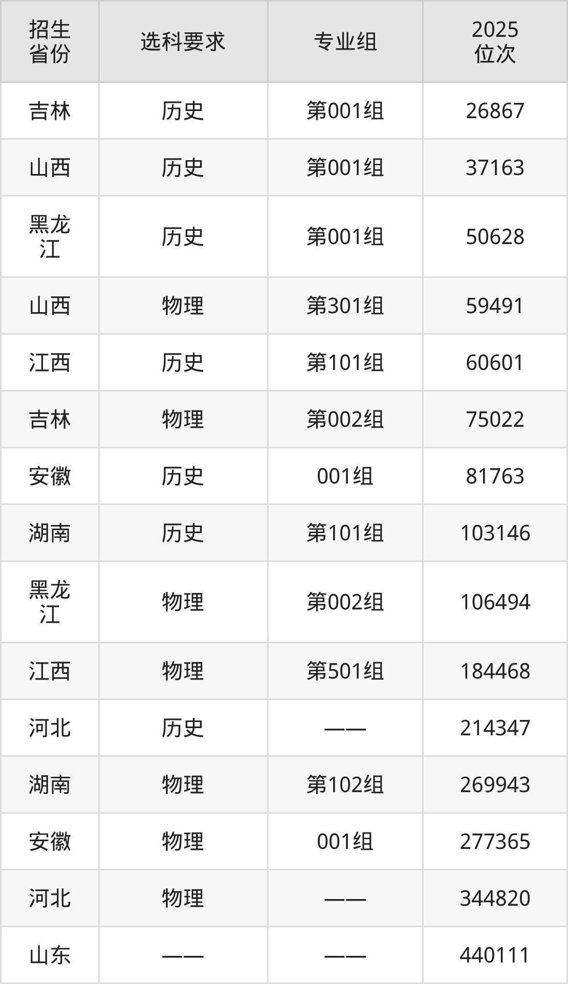 北京科技經(jīng)營(yíng)管理學(xué)院2025年在全國(guó)各省的位次差異較大,最高位次是26867位(吉林歷史類)、最低位次是440111位(山東)。各省具體位次請(qǐng)看下圖: