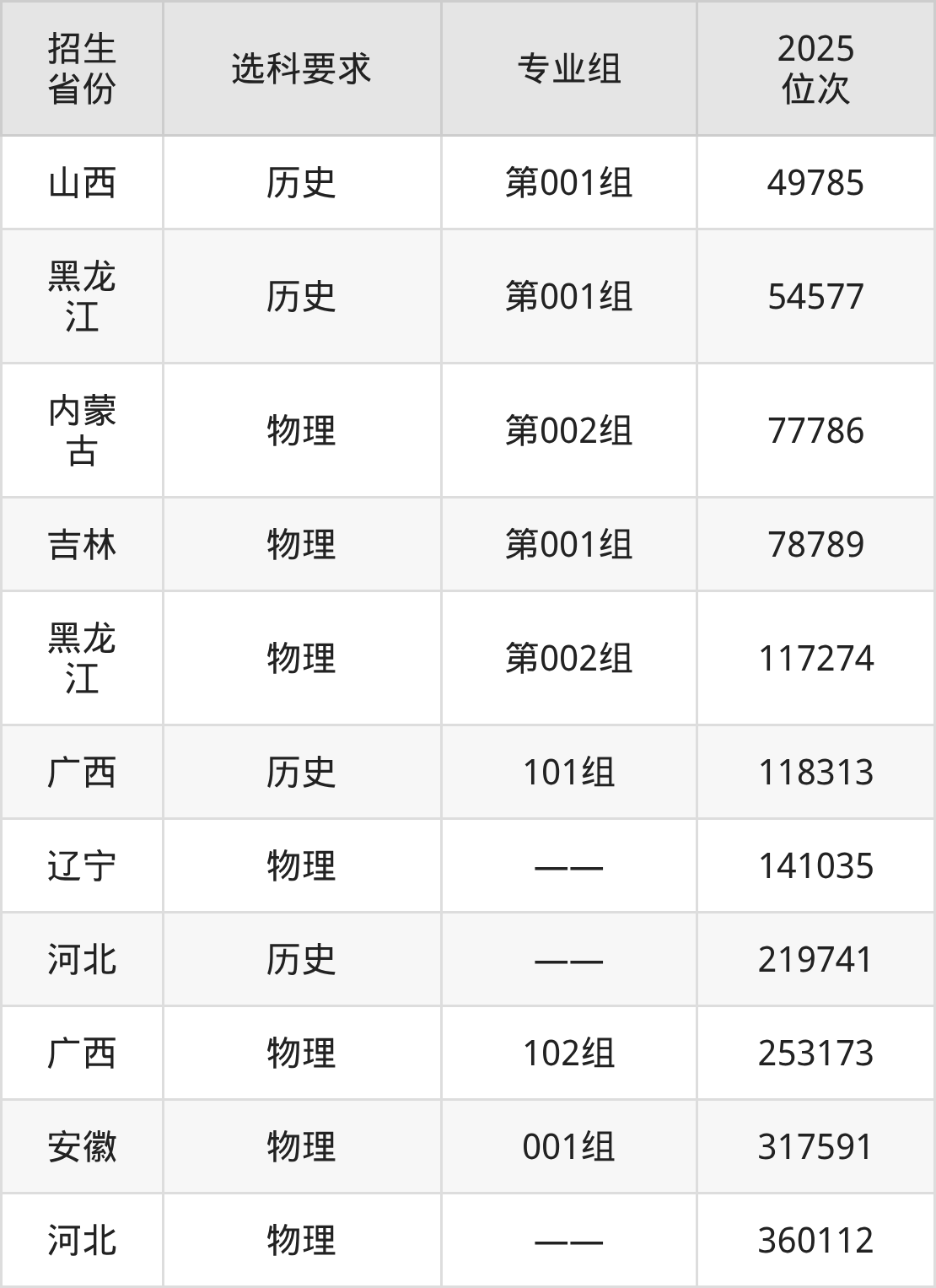 哈爾濱城市職業(yè)學(xué)院2025年在全國各省的位次差異較大,最高位次是49785位(山西歷史類)、最低位次是360112位(河北物理類)。各省具體位次請看下圖: