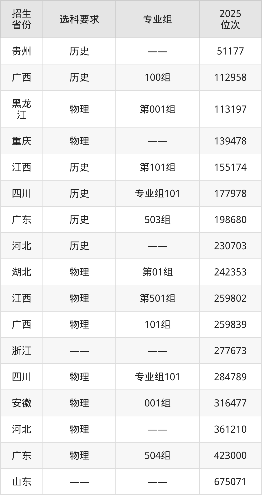 漳州科技職業(yè)學(xué)院2025年在全國各省的位次差異較大,最高位次是51177位(貴州歷史類)、最低位次是675071位(山東)。各省具體位次請看下圖: