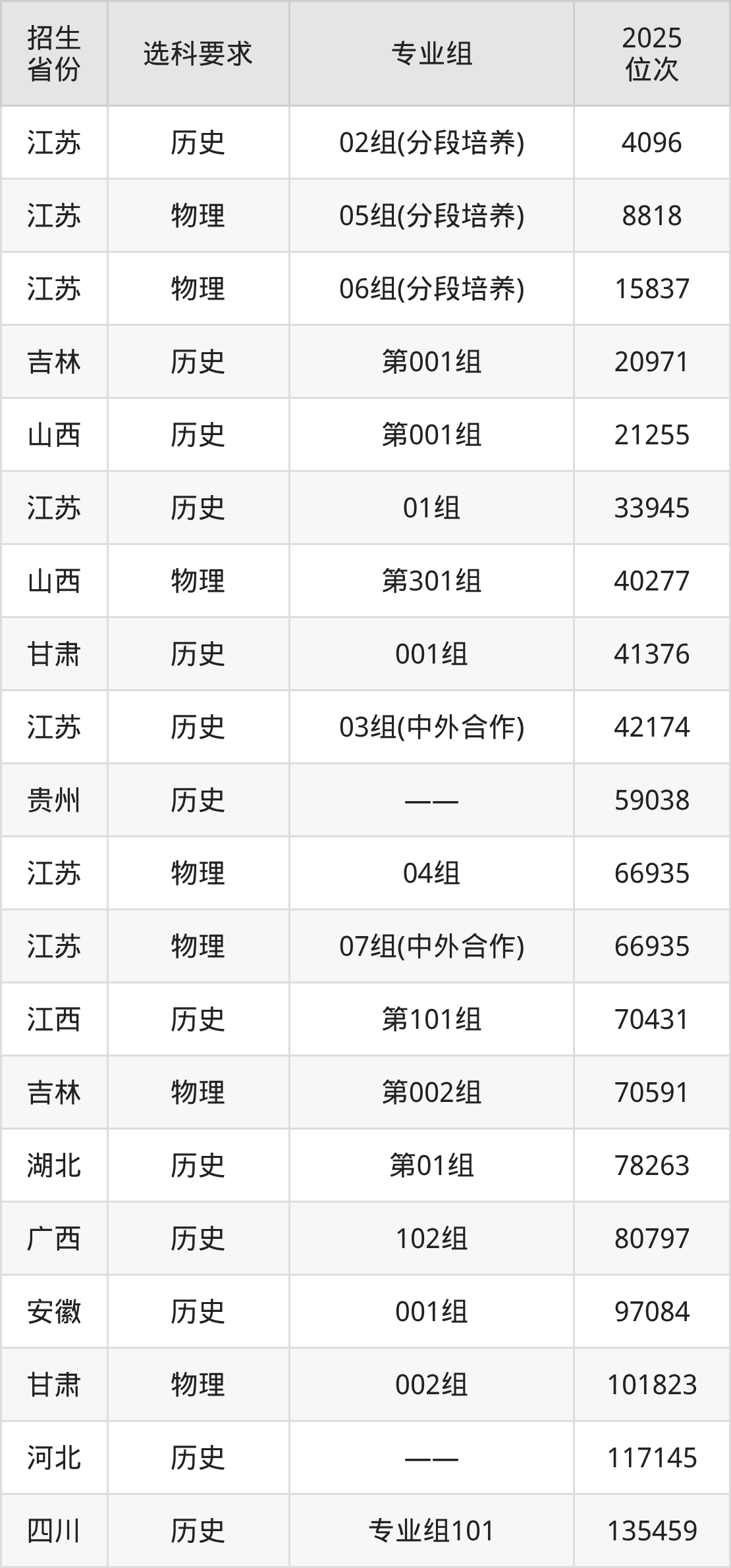 江蘇城鄉(xiāng)建設(shè)職業(yè)學(xué)院2025年在全國各省的位次差異較大,最高位次是4096位(江蘇歷史類)、最低位次是402447位(山東)。各省具體位次請看下圖: