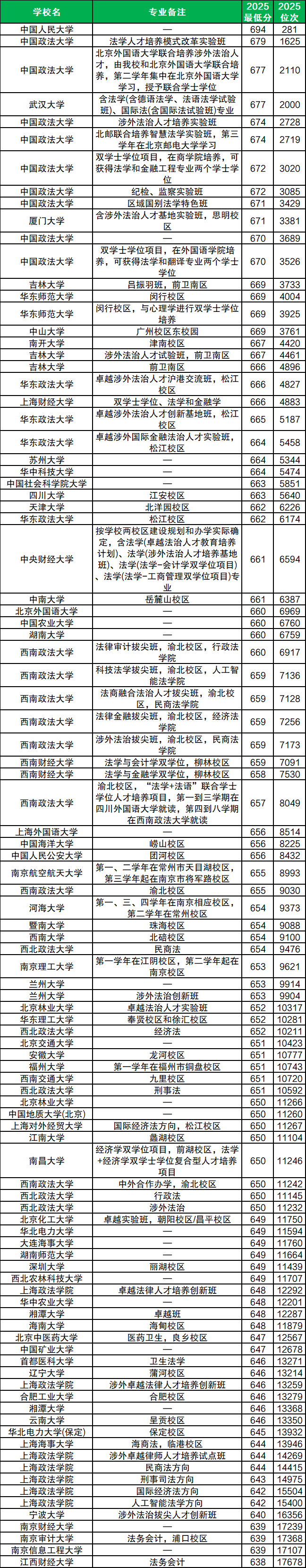 其次是中國(guó)政法大學(xué),2025年該校法學(xué)招生類型共有9個(gè),包含法學(xué)人才培養(yǎng)模式改革實(shí)驗(yàn)班、涉外法治人才培養(yǎng)實(shí)驗(yàn)班、北郵聯(lián)合培養(yǎng)智慧法學(xué)實(shí)驗(yàn)班等,最低分?jǐn)?shù)線為670分,位次在3689名及以內(nèi)的考生可以報(bào)考。