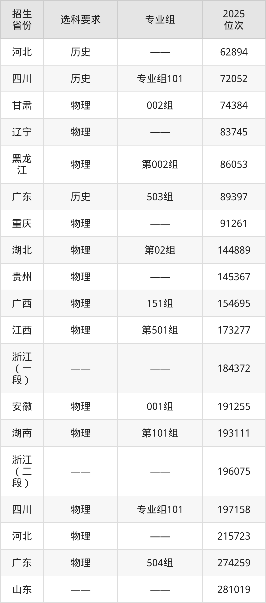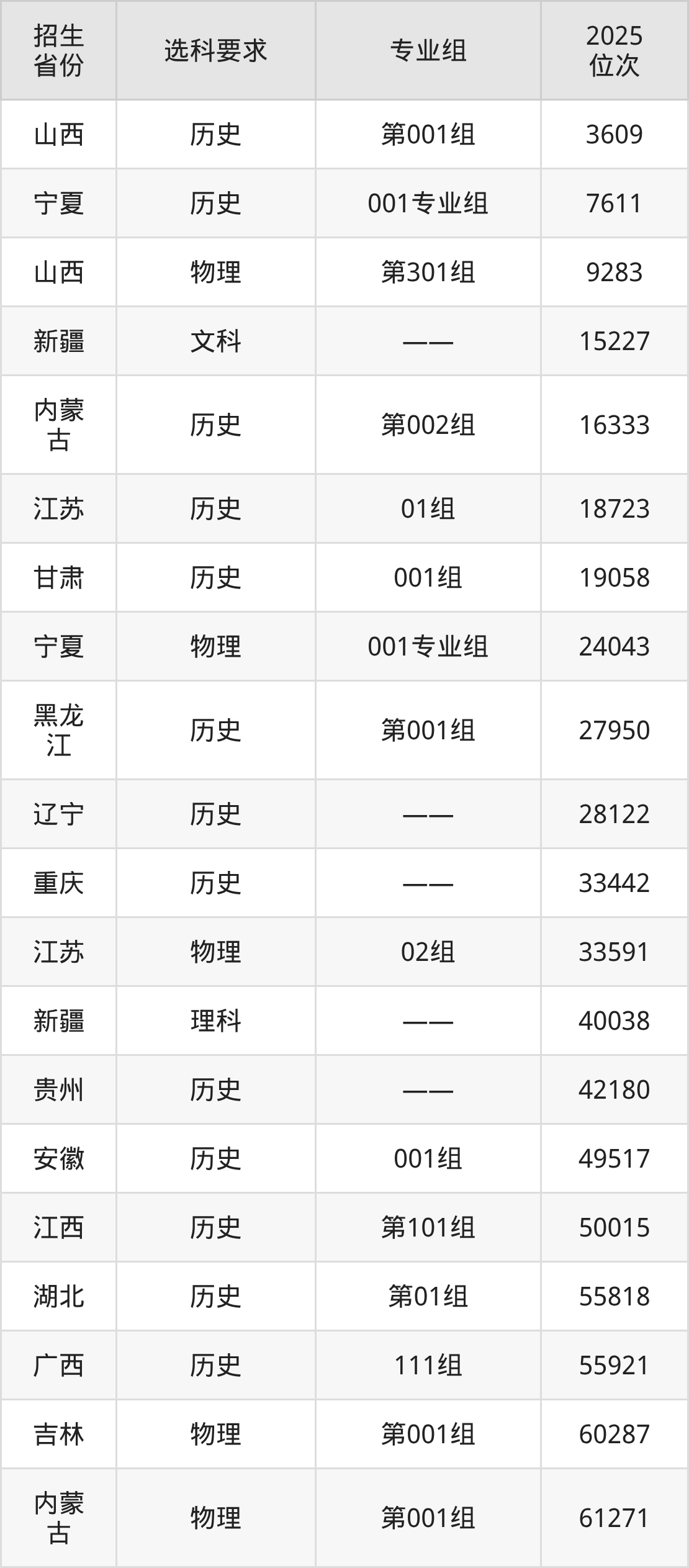 西安鐵路職業(yè)技術(shù)學(xué)院2025年在全國各省的位次差異較大,最高位次是3609位(山西歷史類)、最低位次是281019位(山東)。各省具體位次請看下圖: