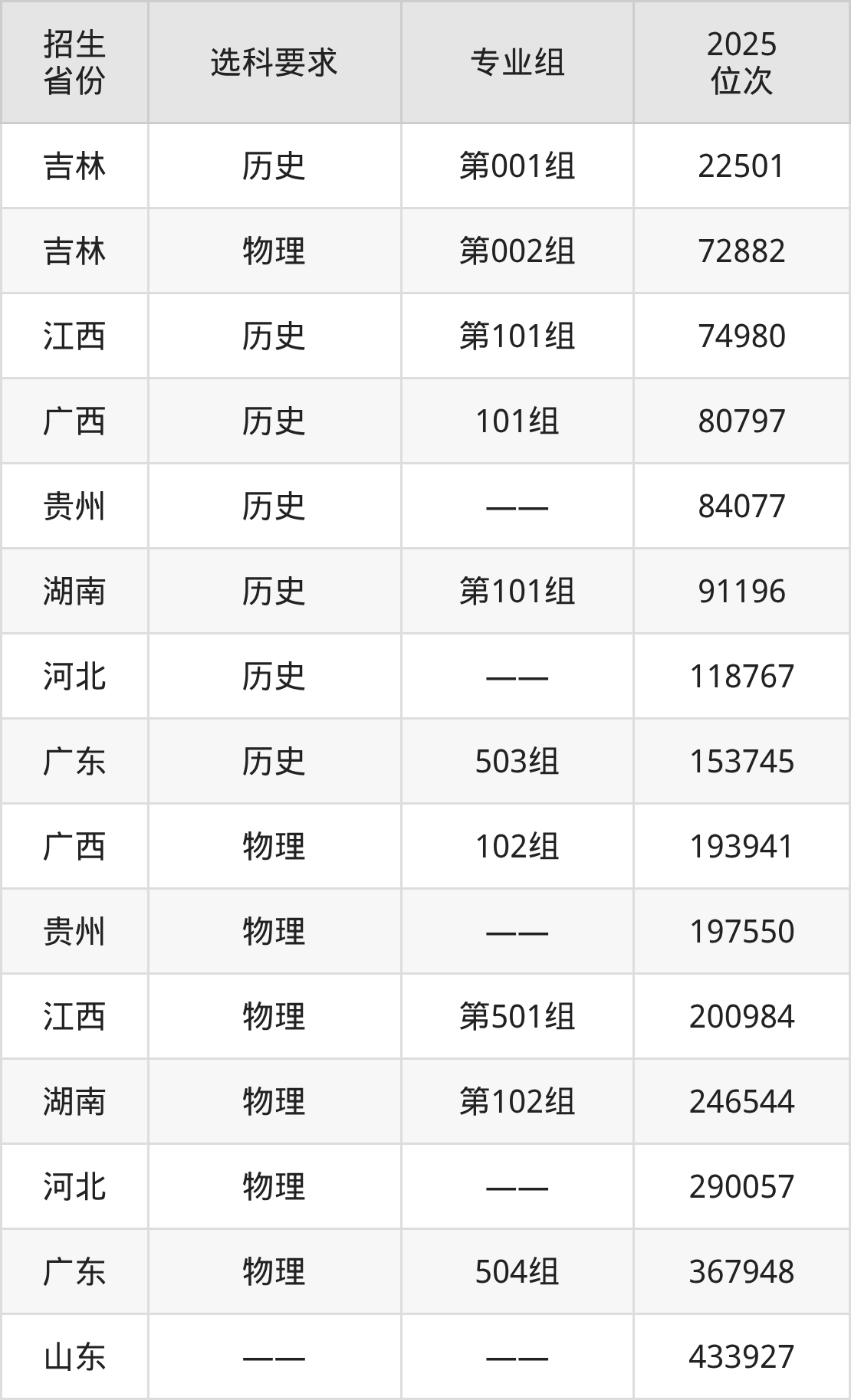 湖南現(xiàn)代物流職業(yè)技術(shù)學(xué)院2025年在全國(guó)各省的位次差異較大,最高位次是22501位(吉林歷史類)、最低位次是433927位(山東)。各省具體位次請(qǐng)看下圖: