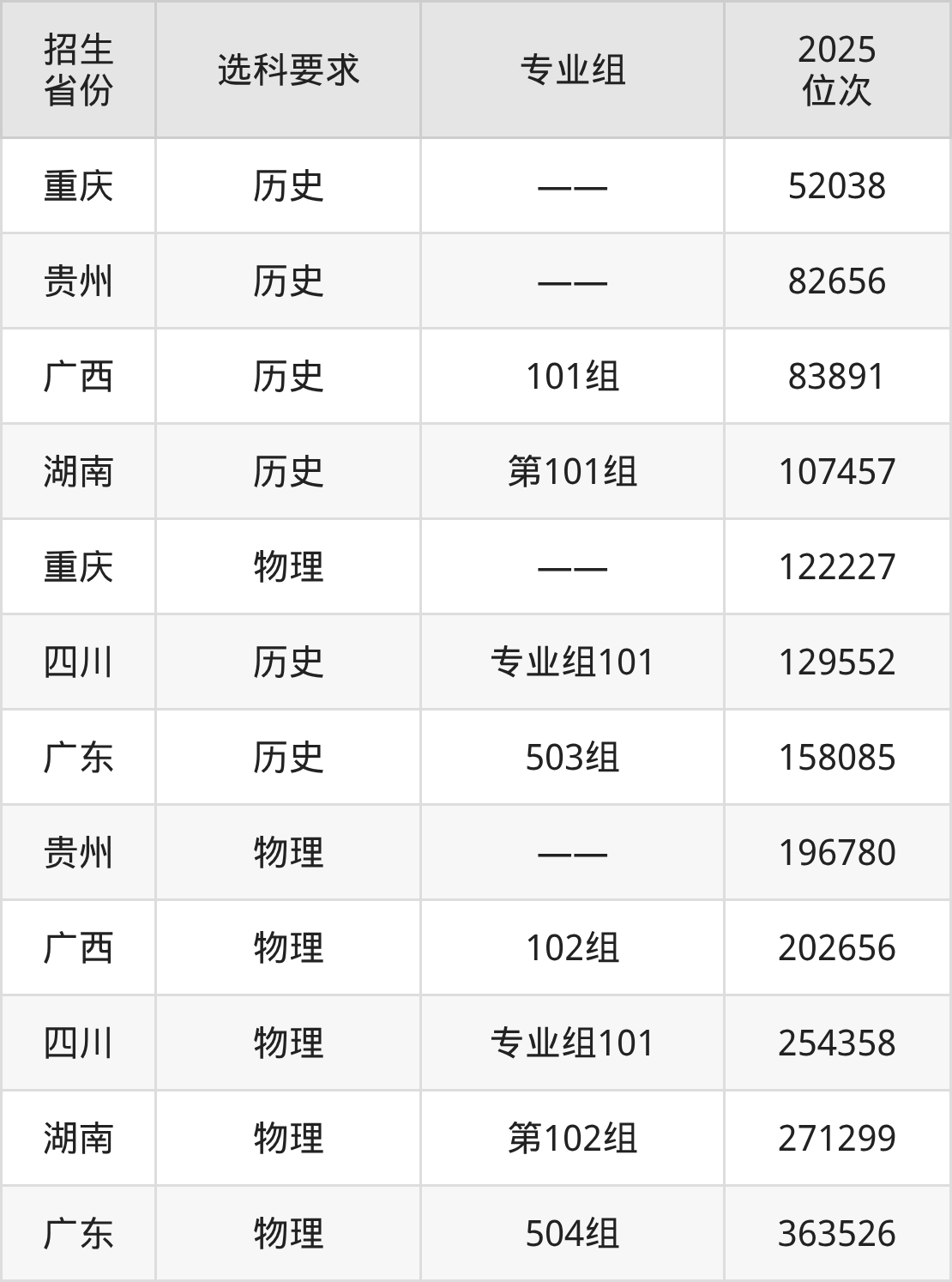 郴州職業(yè)技術(shù)學(xué)院2025年在全國各省的位次差異較大,最高位次是52038位(重慶歷史類)、最低位次是363526位(廣東物理類)。各省具體位次請(qǐng)看下圖: