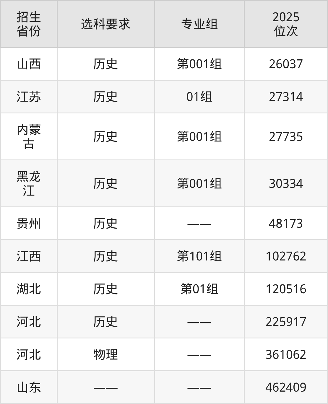 北京藝術傳媒職業(yè)學院2025年在全國各省的位次差異較大,最高位次是26037位(山西歷史類)、最低位次是462409位(山東)。各省具體位次請看下圖: