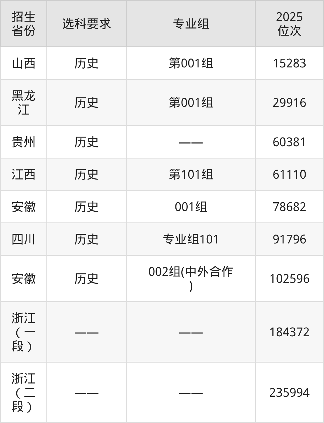 浙江紡織服裝職業(yè)技術(shù)學(xué)院2025年在全國各省的位次差異較大,最高位次是15283位(山西歷史類)、最低位次是235994位(浙江)。各省具體位次請看下圖: