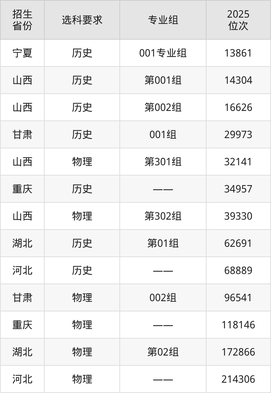 山西衛(wèi)生健康職業(yè)學(xué)院2025年在全國(guó)各省的位次差異較大,最高位次是13861位(寧夏歷史類)、最低位次是214306位(河北物理類)。各省具體位次請(qǐng)看下圖: