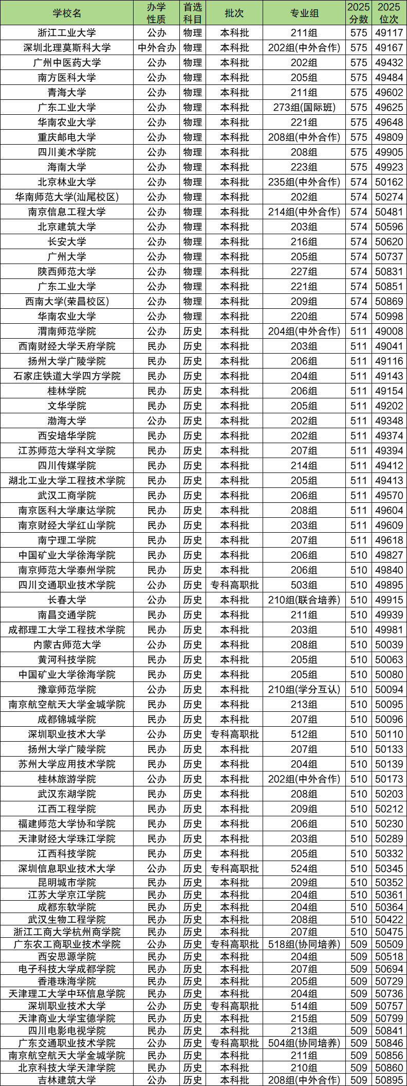 對于廣東歷史類考生而言,高考排名5萬名左右大概率只能選擇民辦本科或者是公辦??疲軌驌炻┑墓k本科很少,有內蒙古師范大學208組(50039名)、渤海大學(49348名)、長春大學210組聯(lián)合培養(yǎng)(49915名)等。歷史類5萬名左右對應高考分數(shù)是509分到511分,最高位次49008名對應渭南師范學院204組(中外合作)、最低位次50895名對應吉林建筑大學208組(中外合作)。