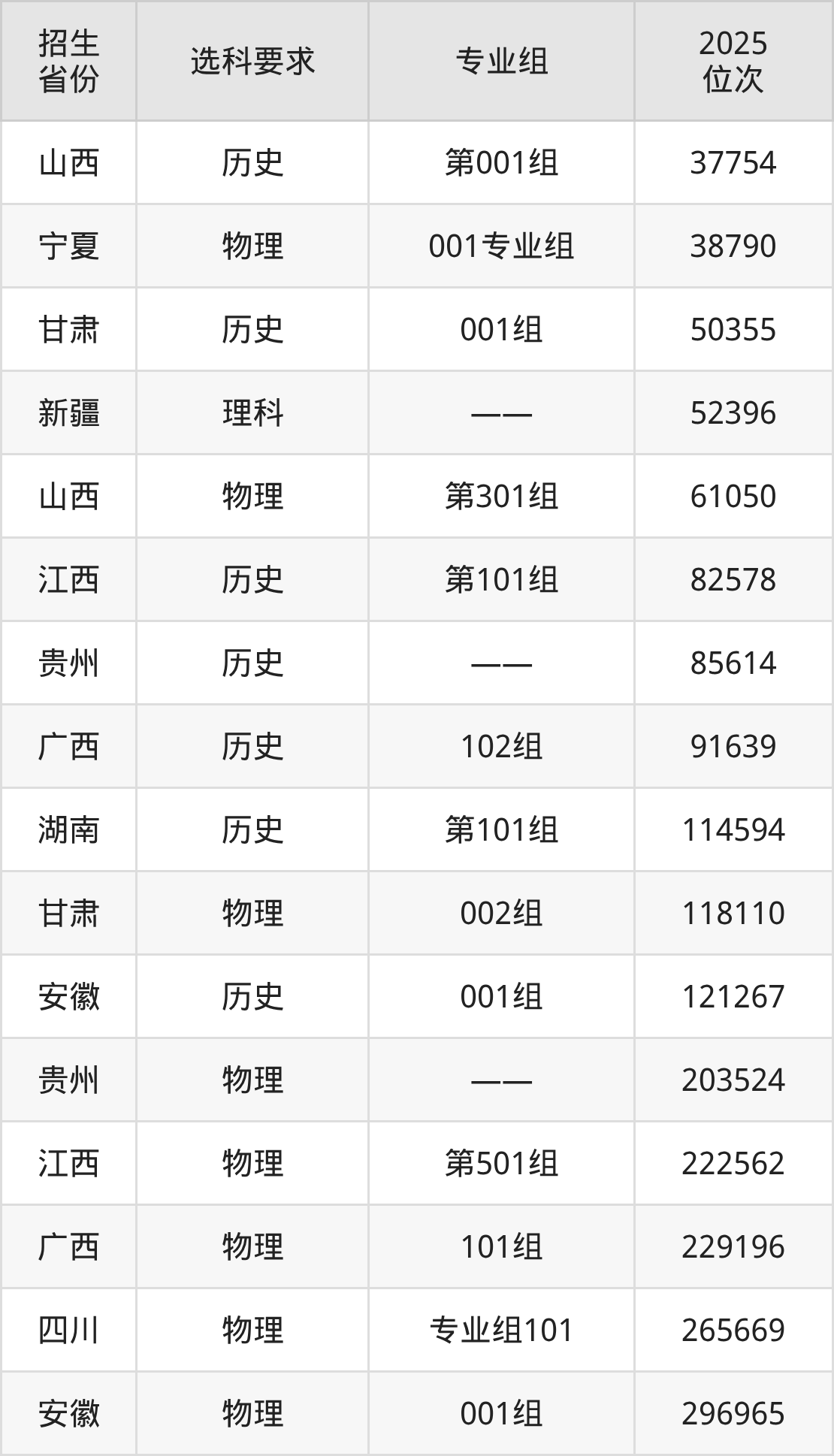閩北職業(yè)技術(shù)學(xué)院2025年在全國各省的位次差異較大,最高位次是37754位(山西歷史類)、最低位次是296965位(安徽物理類)。各省具體位次請看下圖: