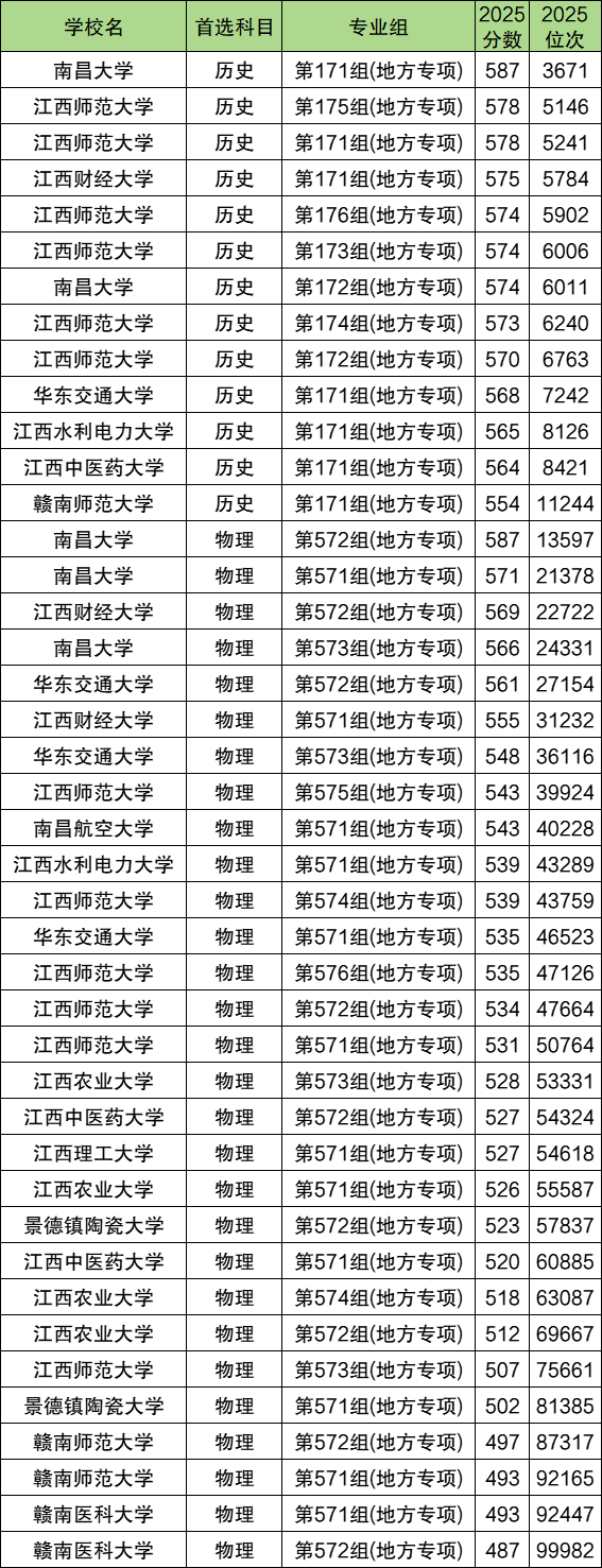 2025年江西地方專(zhuān)項(xiàng)計(jì)劃錄取分?jǐn)?shù)線(xiàn)最高的大學(xué):歷史類(lèi)為南昌大學(xué),對(duì)應(yīng)第171組,最低587分能上;物理類(lèi)為南昌大學(xué)第572組,2025年最低587分能上。