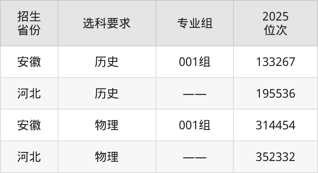 云南科技信息職業(yè)學(xué)院2025年在全國各省的位次差異較大,最高位次是133267位(安徽歷史類)、最低位次是352332位(河北物理類)。各省具體位次請看下圖: