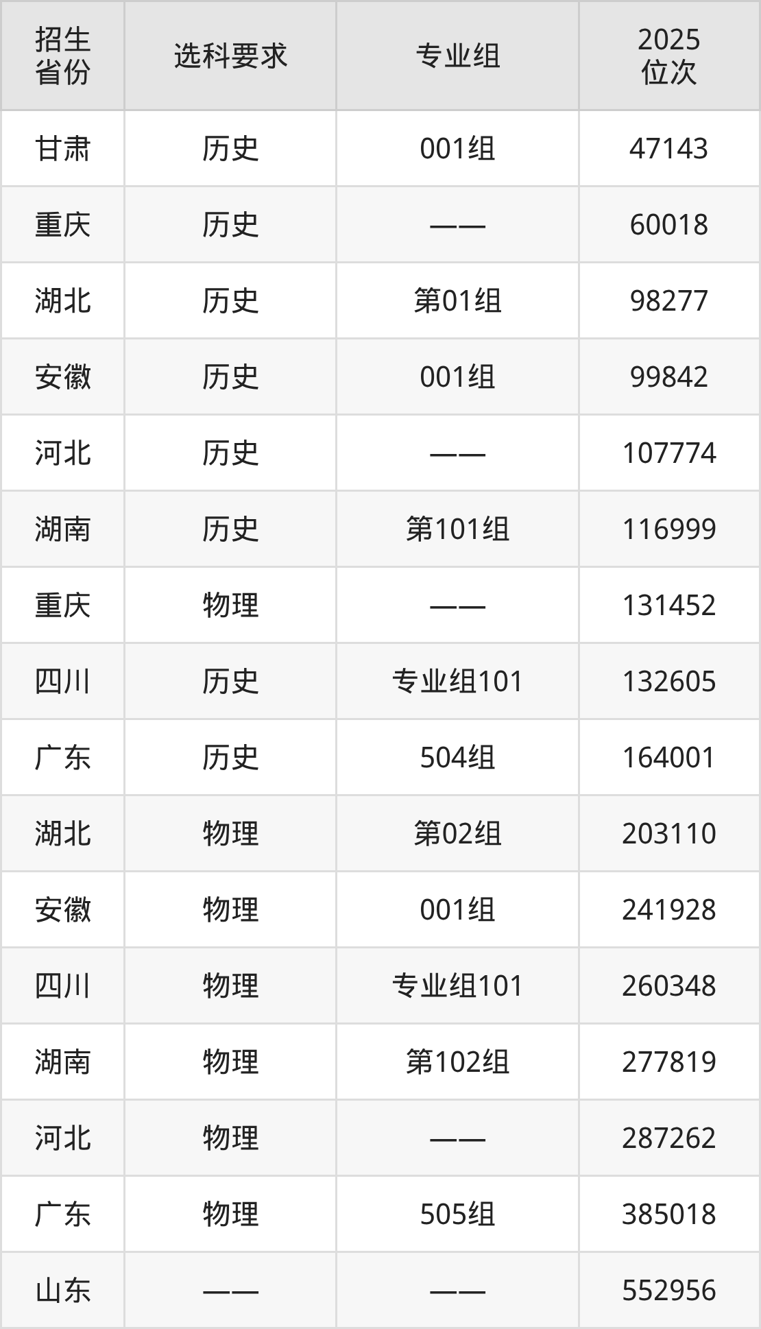 南陽(yáng)農(nóng)業(yè)職業(yè)學(xué)院2025年在全國(guó)各省的位次差異較大,最高位次是47143位(甘肅歷史類)、最低位次是552956位(山東)。各省具體位次請(qǐng)看下圖: