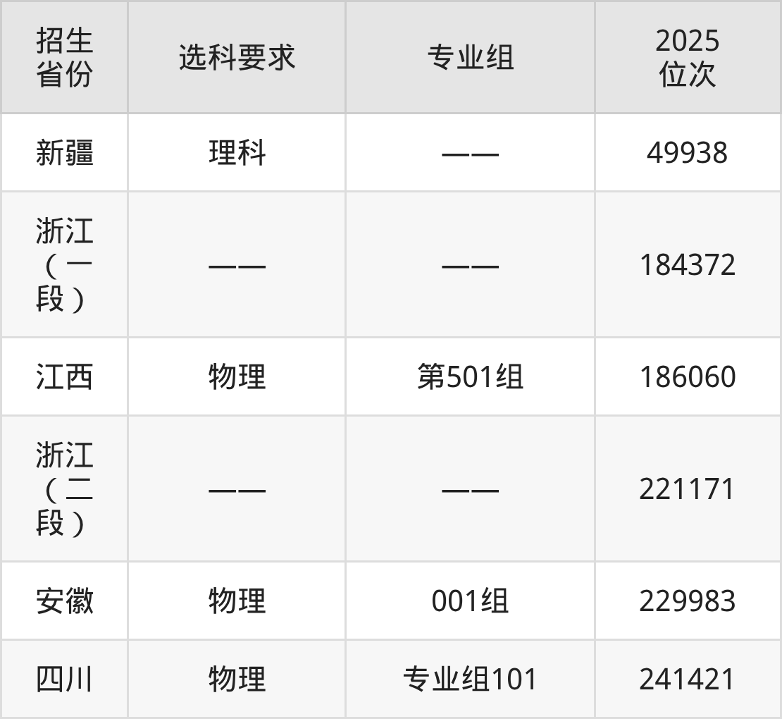 臺(tái)州職業(yè)技術(shù)學(xué)院2025年在全國各省的位次差異較大,最高位次是49938位(新疆理科)、最低位次是241421位(四川物理類)。各省具體位次請看下圖: