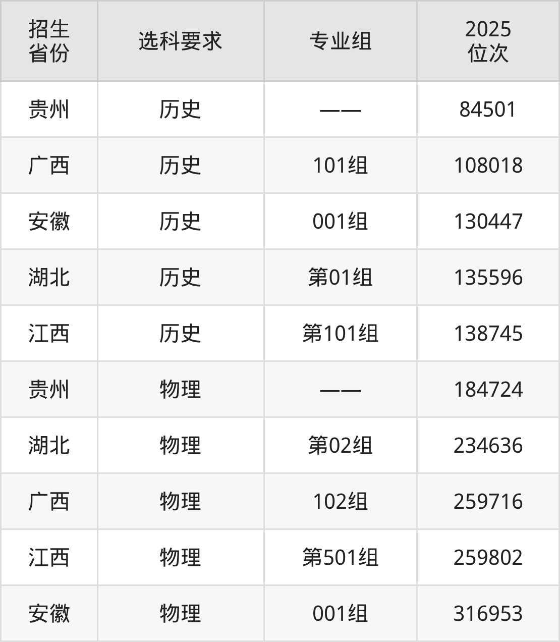 福州黎明職業(yè)技術(shù)學(xué)院2025年在全國(guó)各省的位次差異較大,最高位次是84501位(貴州歷史類)、最低位次是316953位(安徽物理類)。各省具體位次請(qǐng)看下圖: