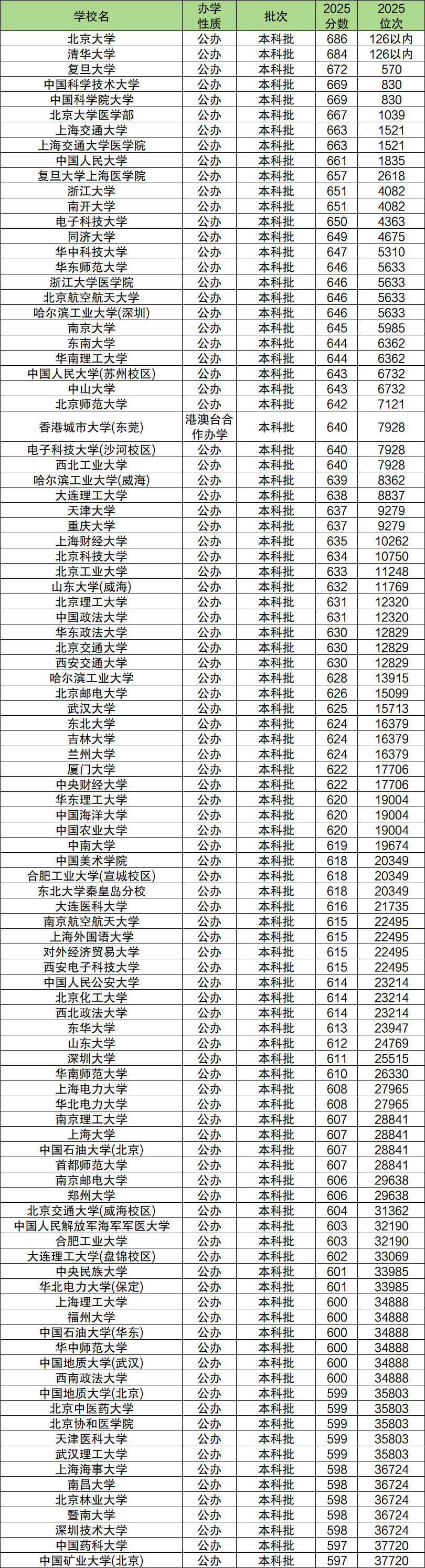 特控線上錄取分?jǐn)?shù)線最高的是北京大學(xué),2025年最低分是686分,位次為126名以內(nèi)。最低分排名前五的大學(xué)名單還包括清華大學(xué)(684分)、復(fù)旦大學(xué)(672分)、中國科學(xué)技術(shù)大學(xué)(669分)和中國科學(xué)院大學(xué)(669分),這些大學(xué)錄取位次在前830名,招生門檻非常高,也是國內(nèi)最好的大學(xué)。