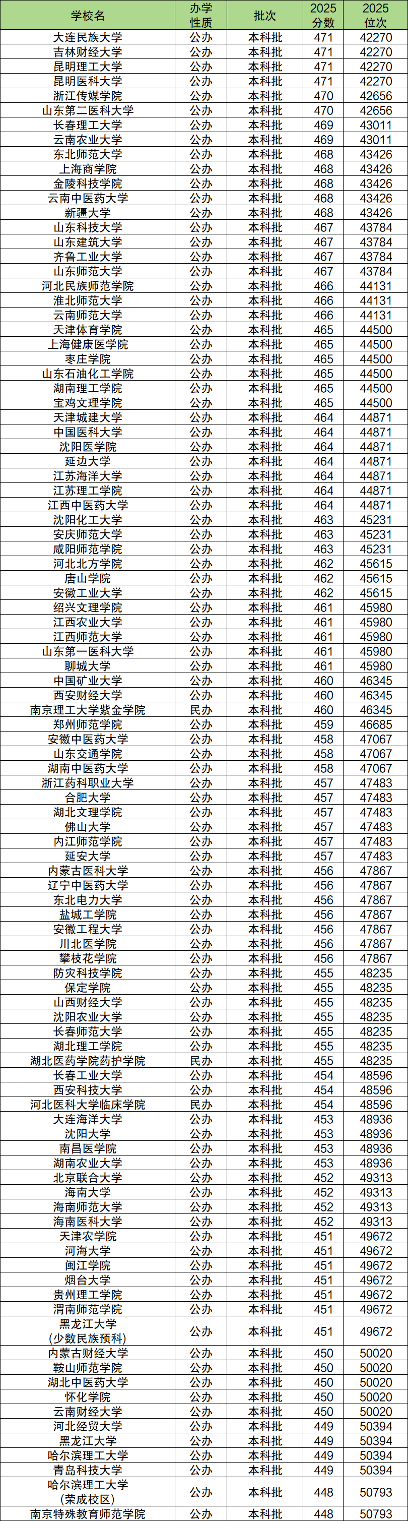 本科線上錄取分數(shù)線最高的是大連民族大學、吉林財經(jīng)大學、昆明理工大學、昆明醫(yī)科大學等,2025年最低分是471分,位次為42270名。最低分超467分的大學名單還包括山東第二醫(yī)科大學(470分)、長春理工大學(469分)、云南農(nóng)業(yè)大學(469分)、東北師范大學(468分)、上海商學院(468分)等,這些大學錄取位次在前4.4萬名。