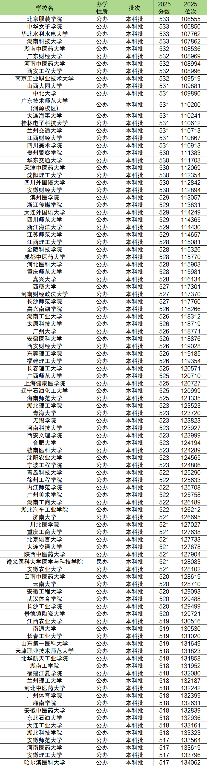 本科線上錄取分?jǐn)?shù)線最高的是北京服裝學(xué)院、中華女子學(xué)院、華北水利水電大學(xué)、湖南科技大學(xué)等,2025年最低分是533分,位次為107862名以內(nèi)。最低分超530分的大學(xué)名單還包括西安工程大學(xué)(532分)、南京工業(yè)職業(yè)技術(shù)大學(xué)(532分)、四川美術(shù)學(xué)院(531分)等,這些大學(xué)錄取位次在前11.1萬(wàn)名。
